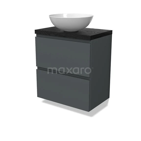 Modulo Plato Slim Badmöbel mit Aufsatzwaschbecken | 60 cm Dunkelgrau Grifflos front Schwarze Eiche blatt 2 übereinanderliegende Schubladen
