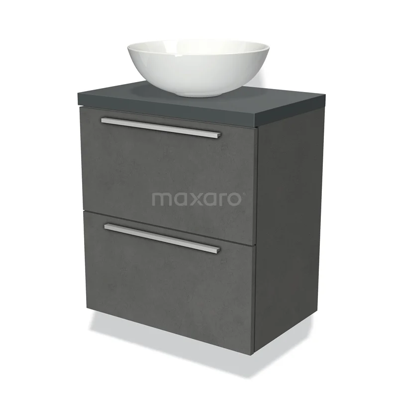 Modulo Plato Slim Badmöbel mit Aufsatzwaschbecken | 60 cm Dunkelgrauer Beton Flach front Dunkelgrau blatt 2 übereinanderliegende Schubladen
