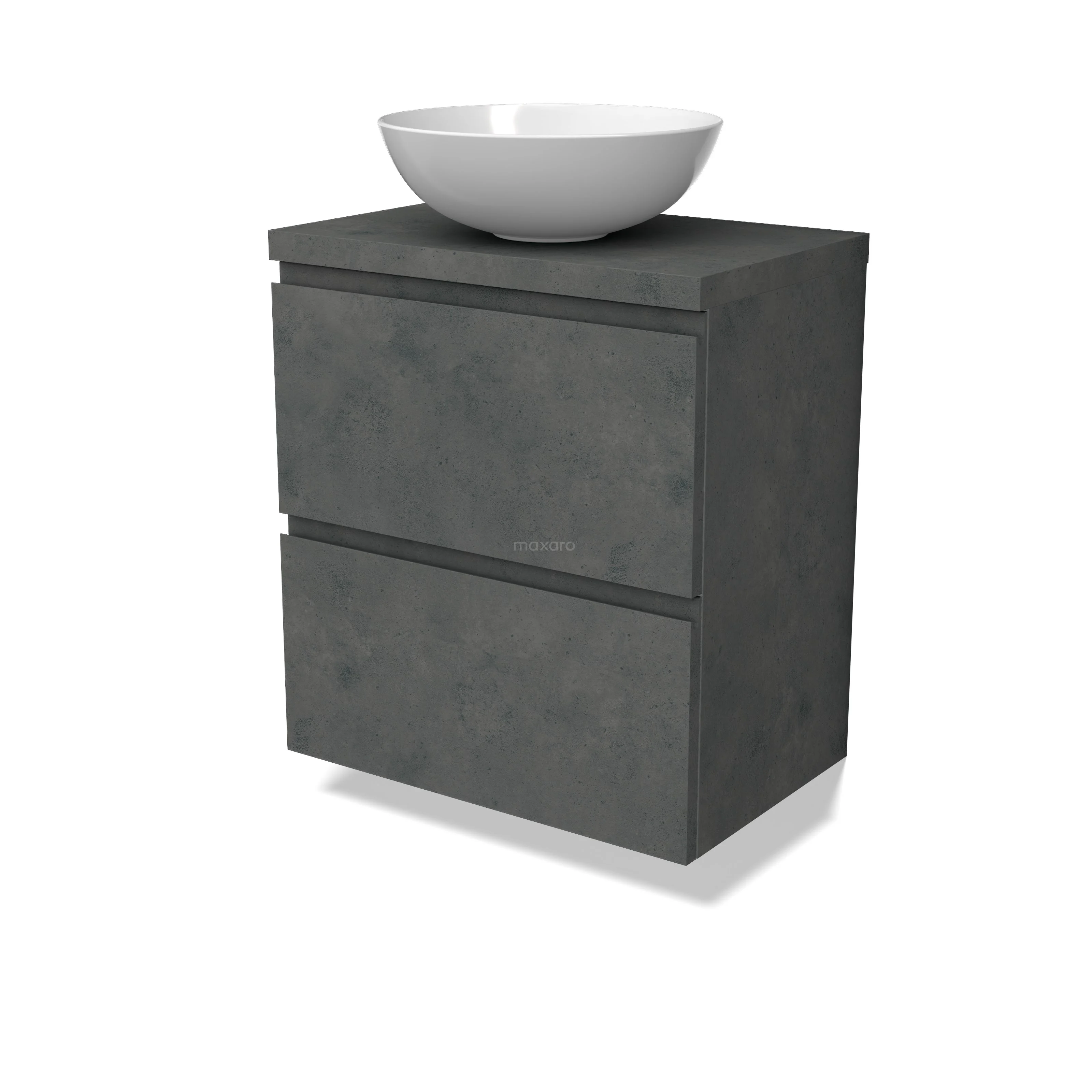 Modulo Plato Slim Badmöbel mit Aufsatzwaschbecken | 60 cm Dunkelgrauer Beton Grifflos front Dunkelgrauer Beton blatt 2 übereinanderliegende Schubladen