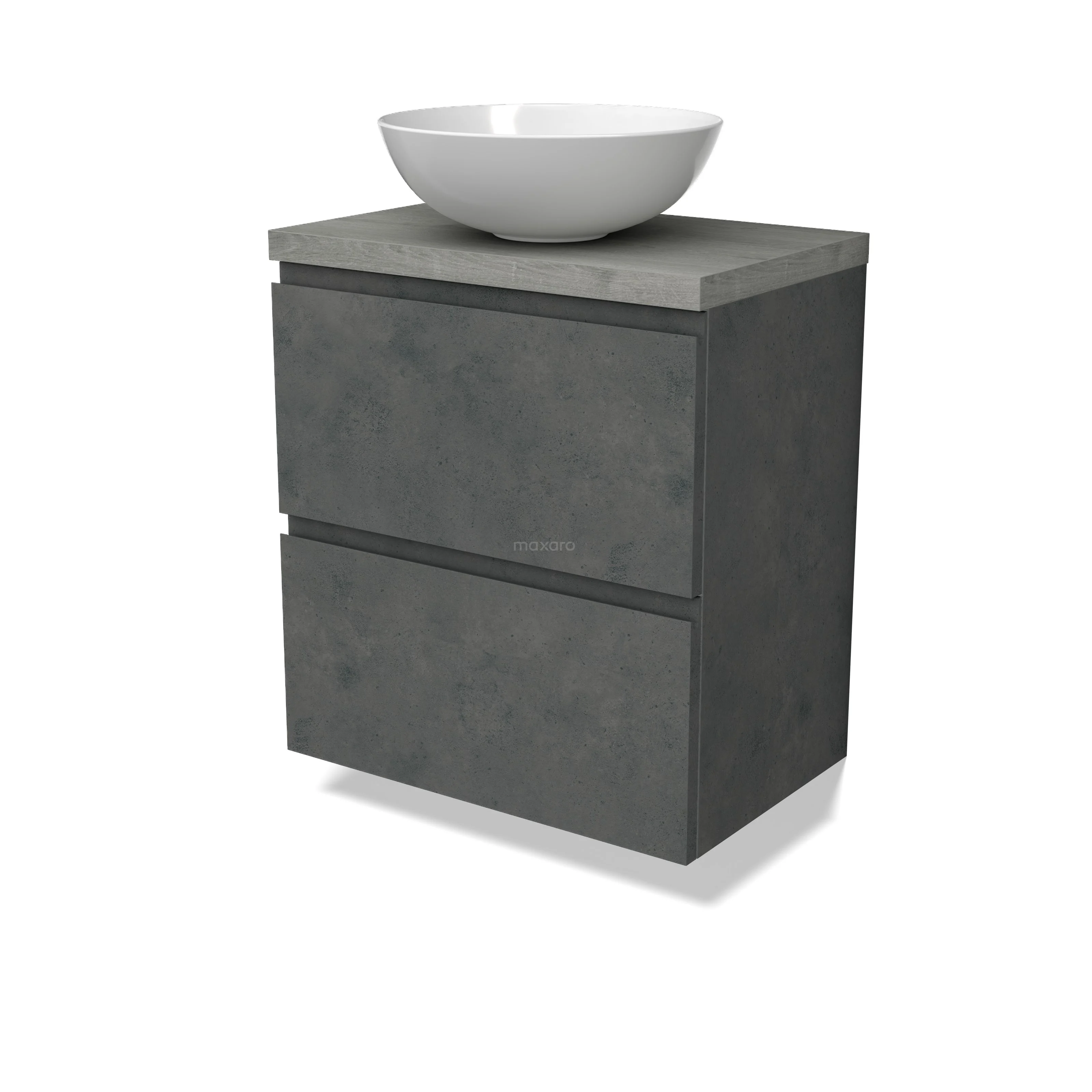 Modulo Plato Slim Badmöbel mit Aufsatzwaschbecken | 60 cm Dunkelgrauer Beton Grifflos front Graue Eiche blatt 2 übereinanderliegende Schubladen