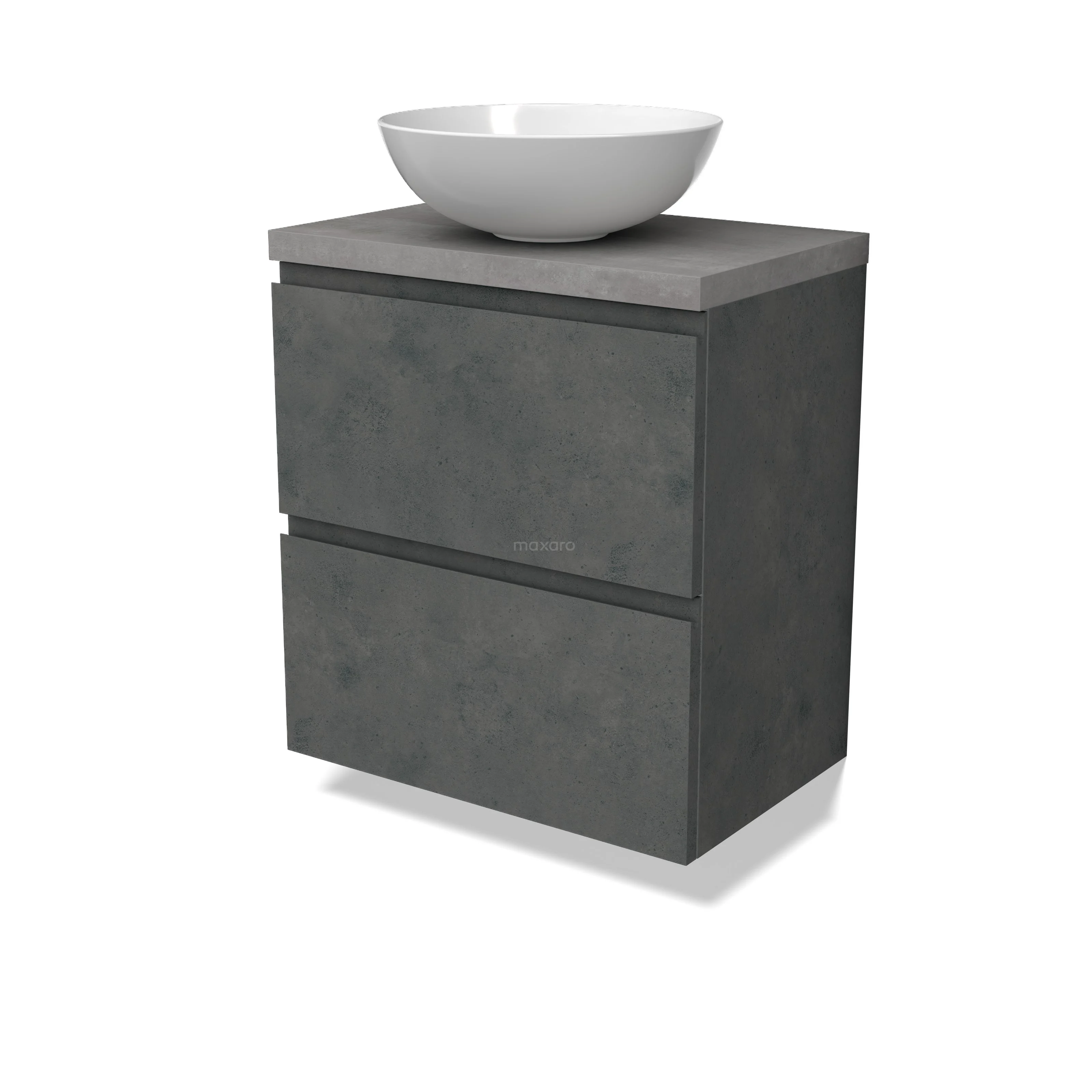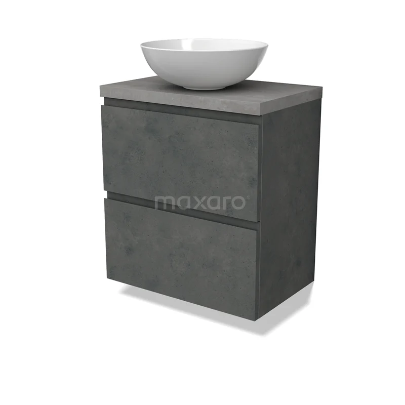 Modulo Plato Slim Badmöbel mit Aufsatzwaschbecken | 60 cm Dunkelgrauer Beton Grifflos front Hellgrauer Beton blatt 2 übereinanderliegende Schubladen
