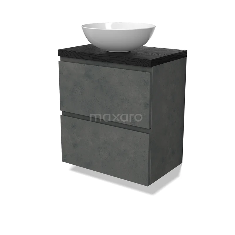 Modulo Plato Slim Badmöbel mit Aufsatzwaschbecken | 60 cm Dunkelgrauer Beton Grifflos front Schwarze Eiche blatt 2 übereinanderliegende Schubladen