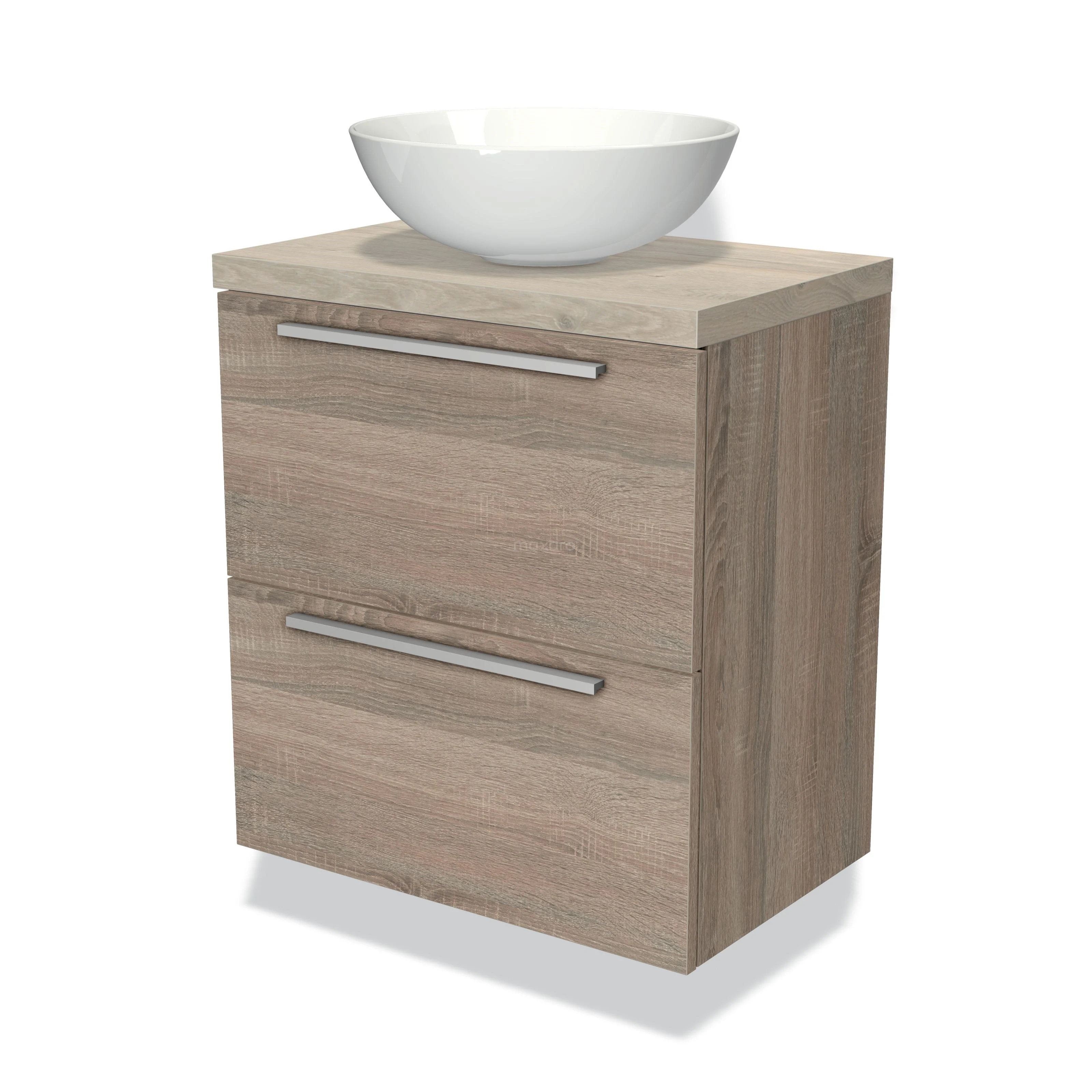 Modulo Plato Slim Badmöbel mit Aufsatzwaschbecken | 60 cm Eiche Flach front Hellgraue Eiche blatt 2 übereinanderliegende Schubladen