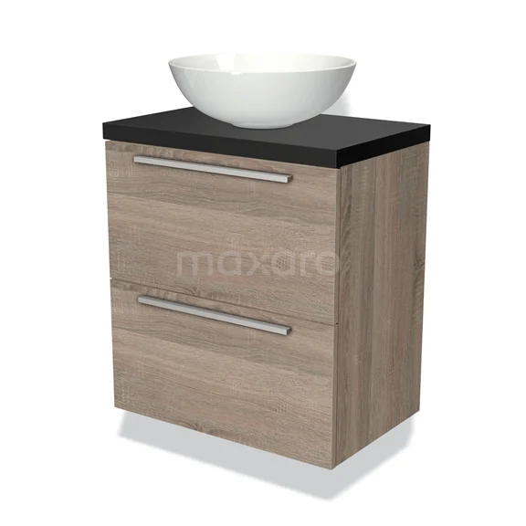 Modulo Plato Slim Badmöbel mit Aufsatzwaschbecken | 60 cm Eiche Flach front Matt Schwarz blatt 2 übereinanderliegende Schubladen