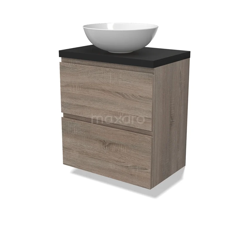 Modulo Plato Slim Badmöbel mit Aufsatzwaschbecken | 60 cm Eiche Grifflos front Matt Schwarz blatt 2 übereinanderliegende Schubladen