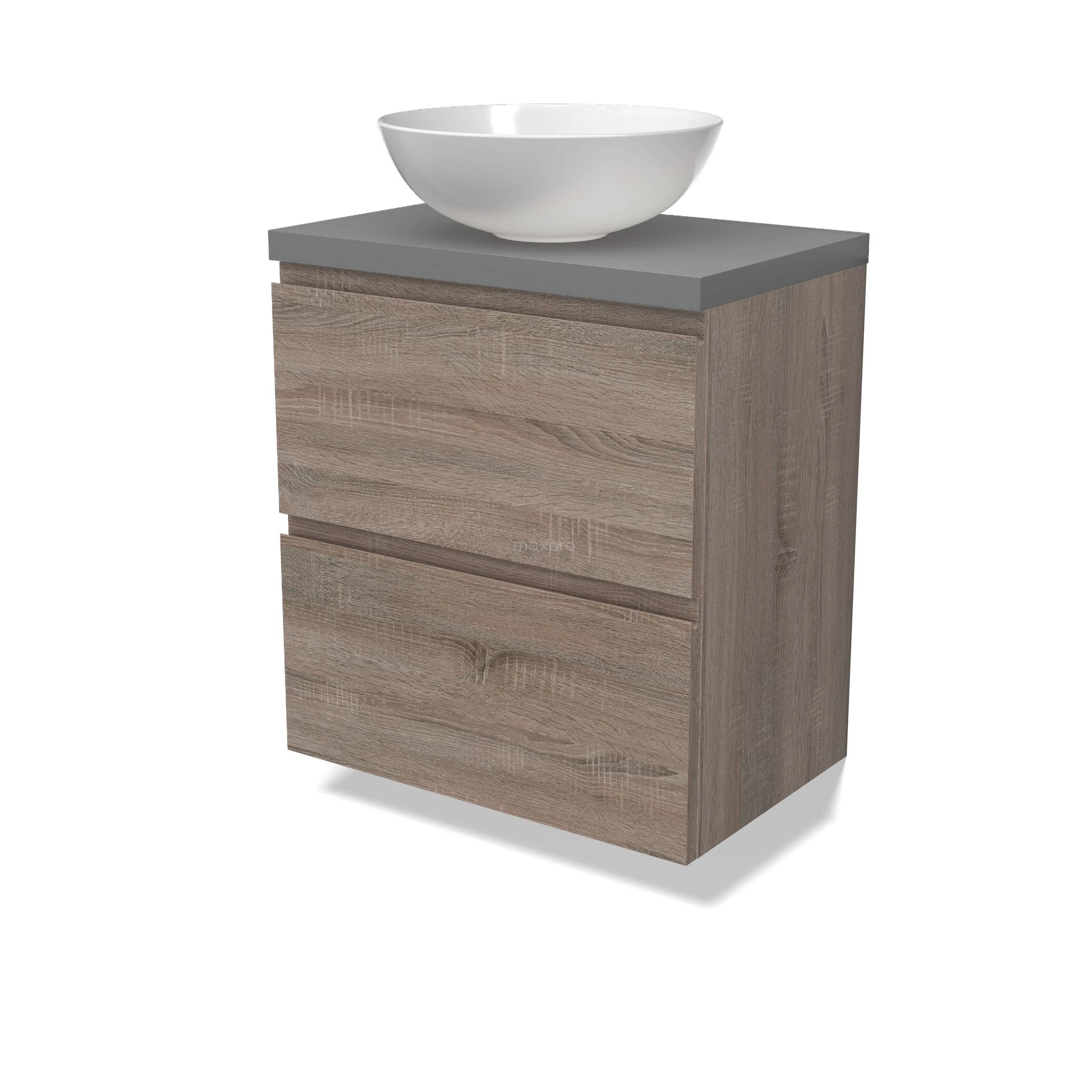 Modulo Plato Slim Badmöbel mit Aufsatzwaschbecken | 60 cm Eiche Grifflos front Mittelgrau blatt 2 übereinanderliegende Schubladen