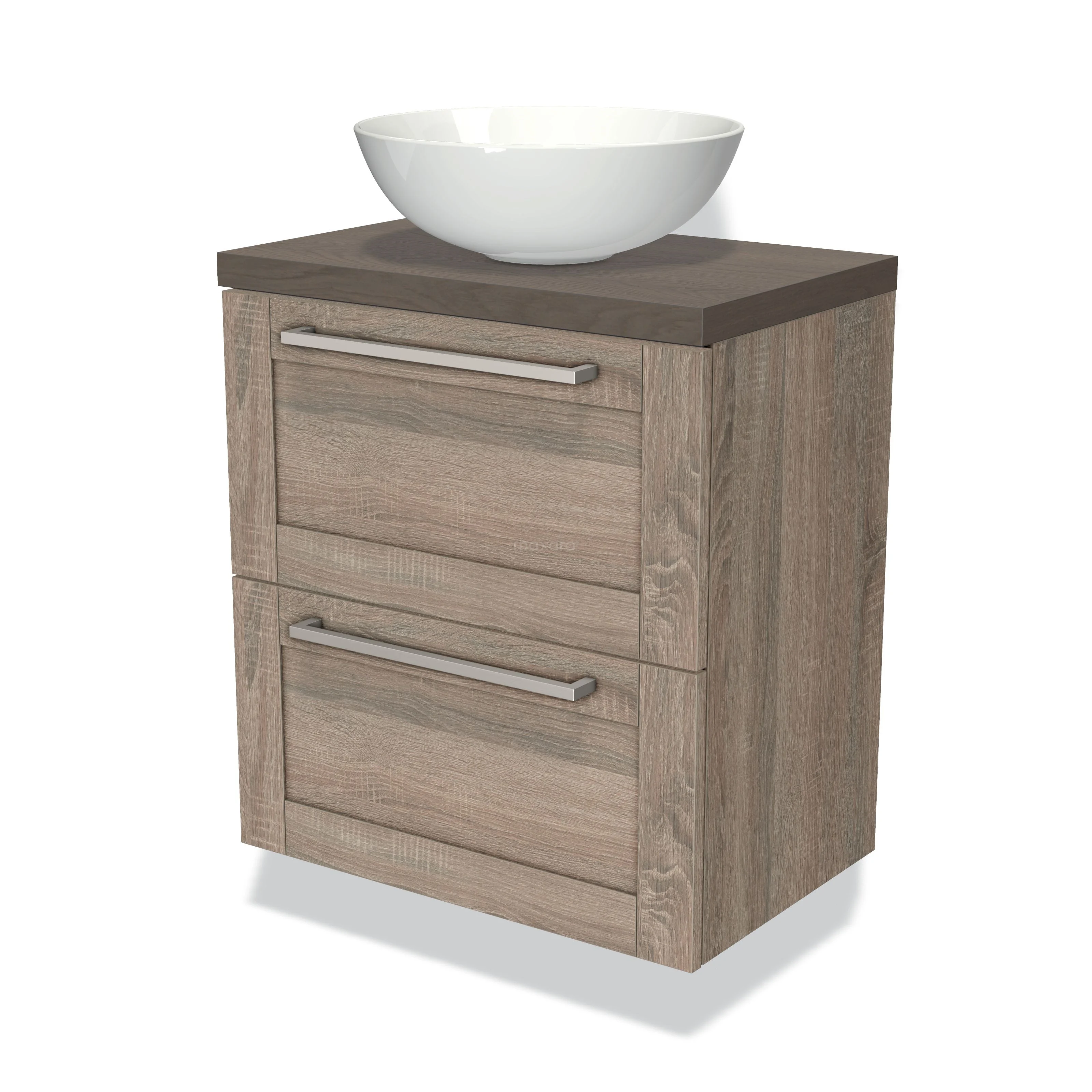 Modulo Plato Slim Badmöbel mit Aufsatzwaschbecken | 60 cm Eiche Rahmen front Dunkelbraune Eiche blatt 2 übereinanderliegende Schubladen