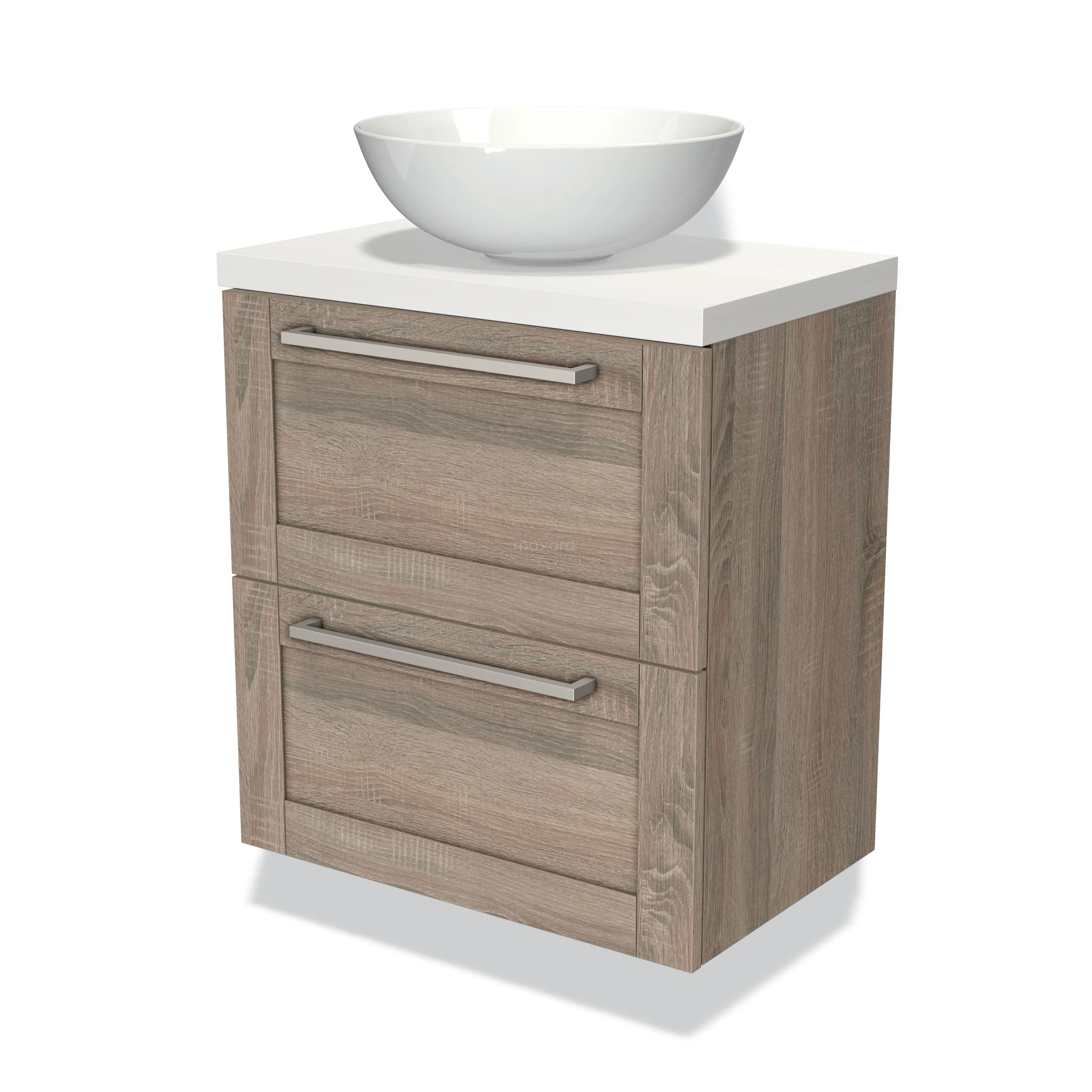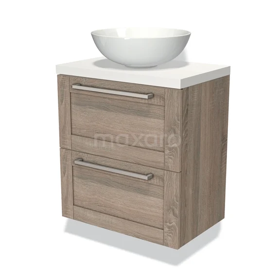 Modulo Plato Slim Badmöbel mit Aufsatzwaschbecken | 60 cm Eiche Rahmen front Matt Weiß blatt 2 übereinanderliegende Schubladen