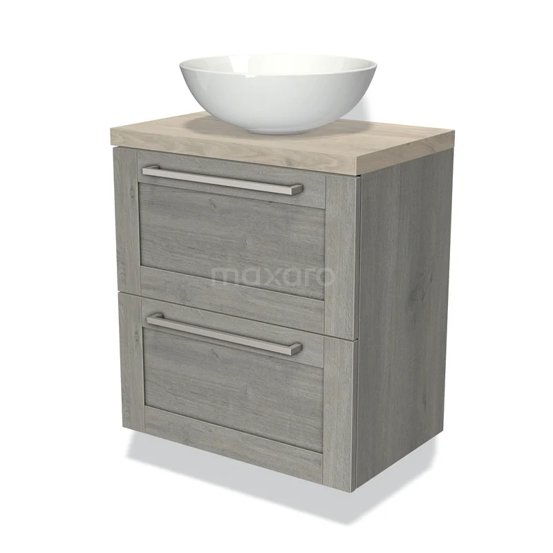 Modulo Plato Slim Badmöbel mit Aufsatzwaschbecken | 60 cm Graue Eiche Rahmen front Hellgraue Eiche blatt 2 übereinanderliegende Schubladen