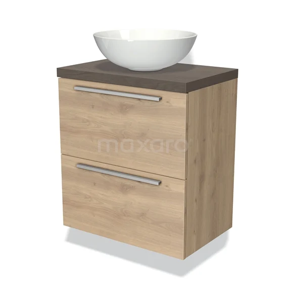 Modulo Plato Slim Badmöbel mit Aufsatzwaschbecken | 60 cm Hellbraune Eiche Flach front Dunkelbraune Eiche blatt 2 übereinanderliegende Schubladen