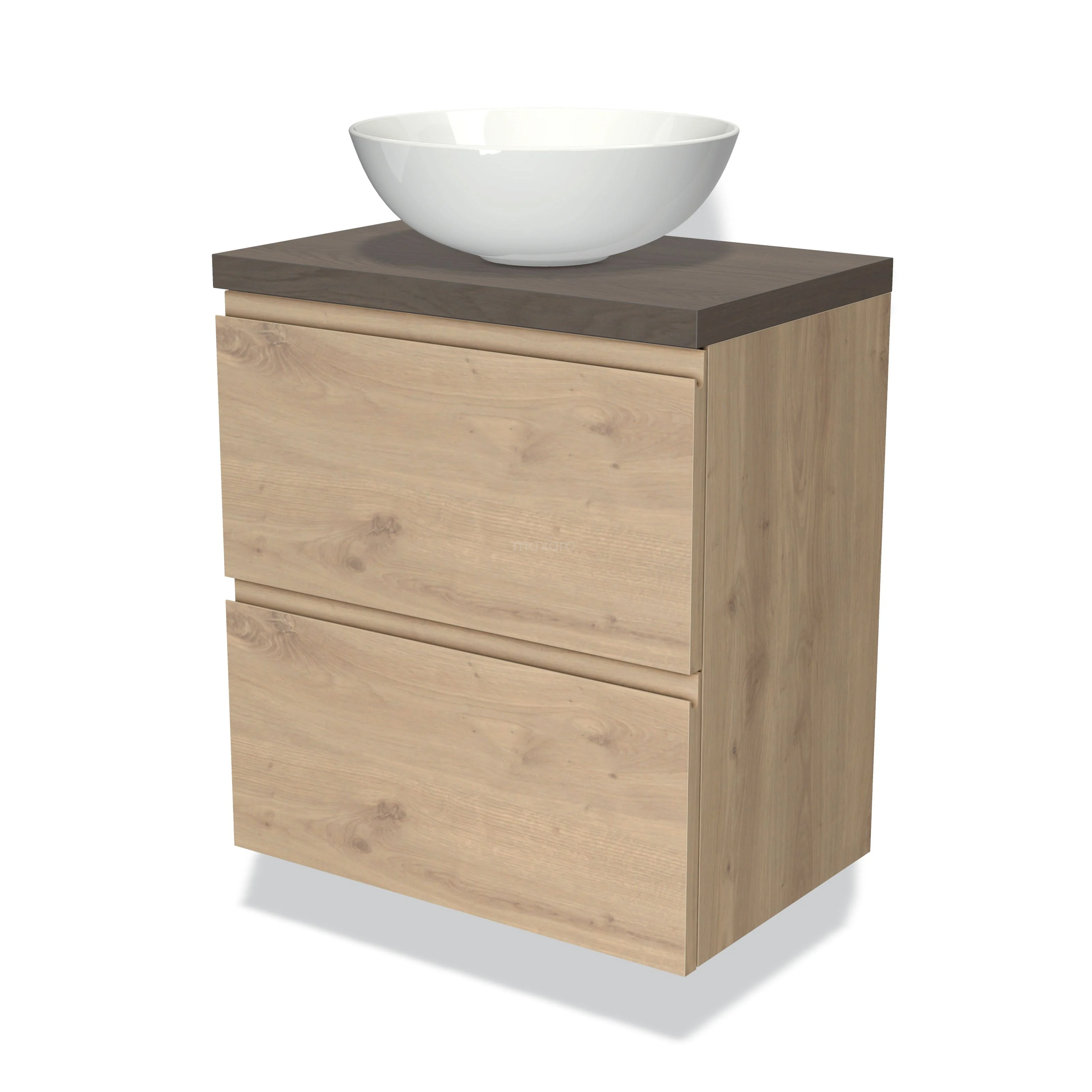 Modulo Plato Slim Badmöbel mit Aufsatzwaschbecken | 60 cm Hellbraune Eiche Grifflos front Dunkelbraune Eiche blatt 2 übereinanderliegende Schubladen