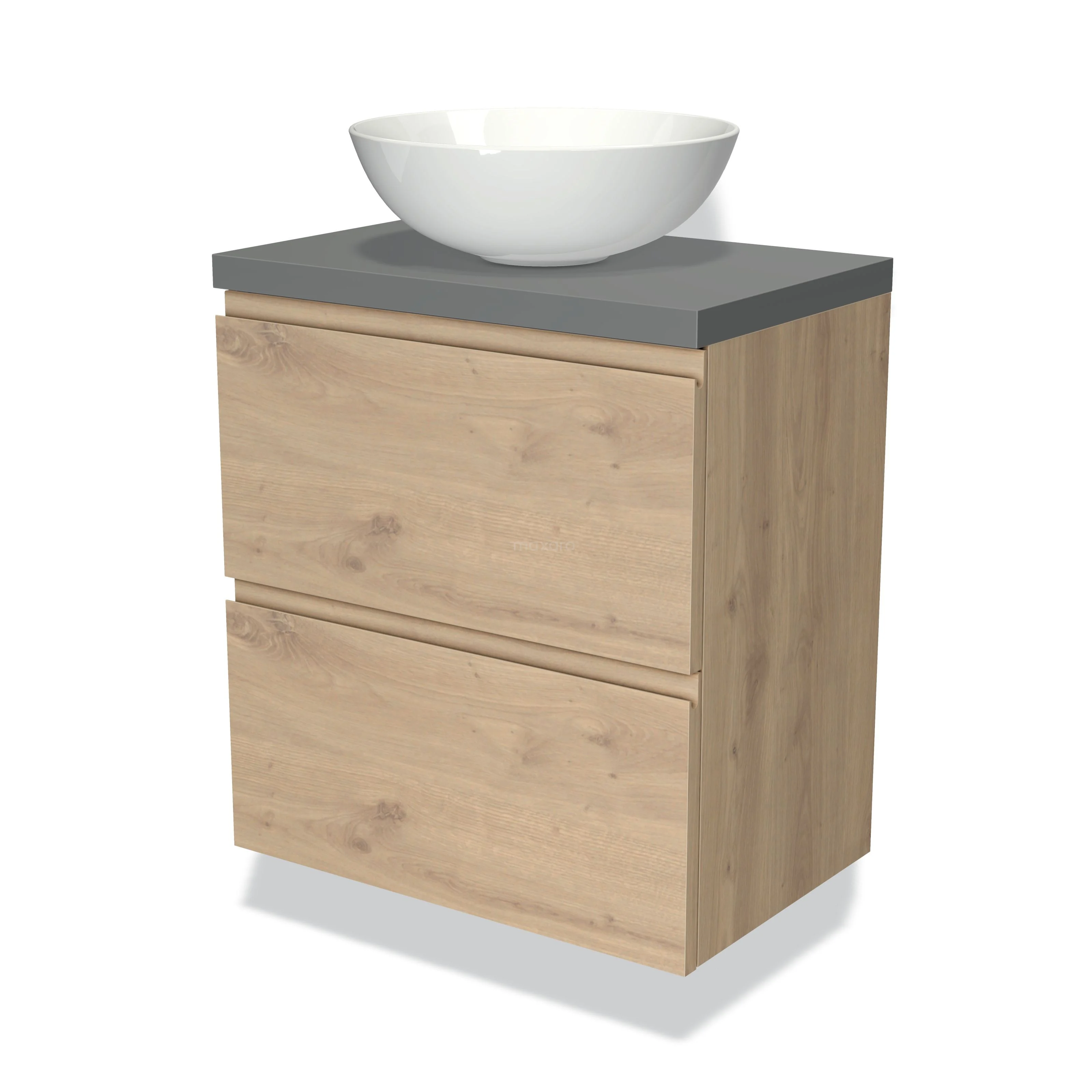 Modulo Plato Slim Badmöbel mit Aufsatzwaschbecken | 60 cm Hellbraune Eiche Grifflos front Mittelgrau blatt 2 übereinanderliegende Schubladen
