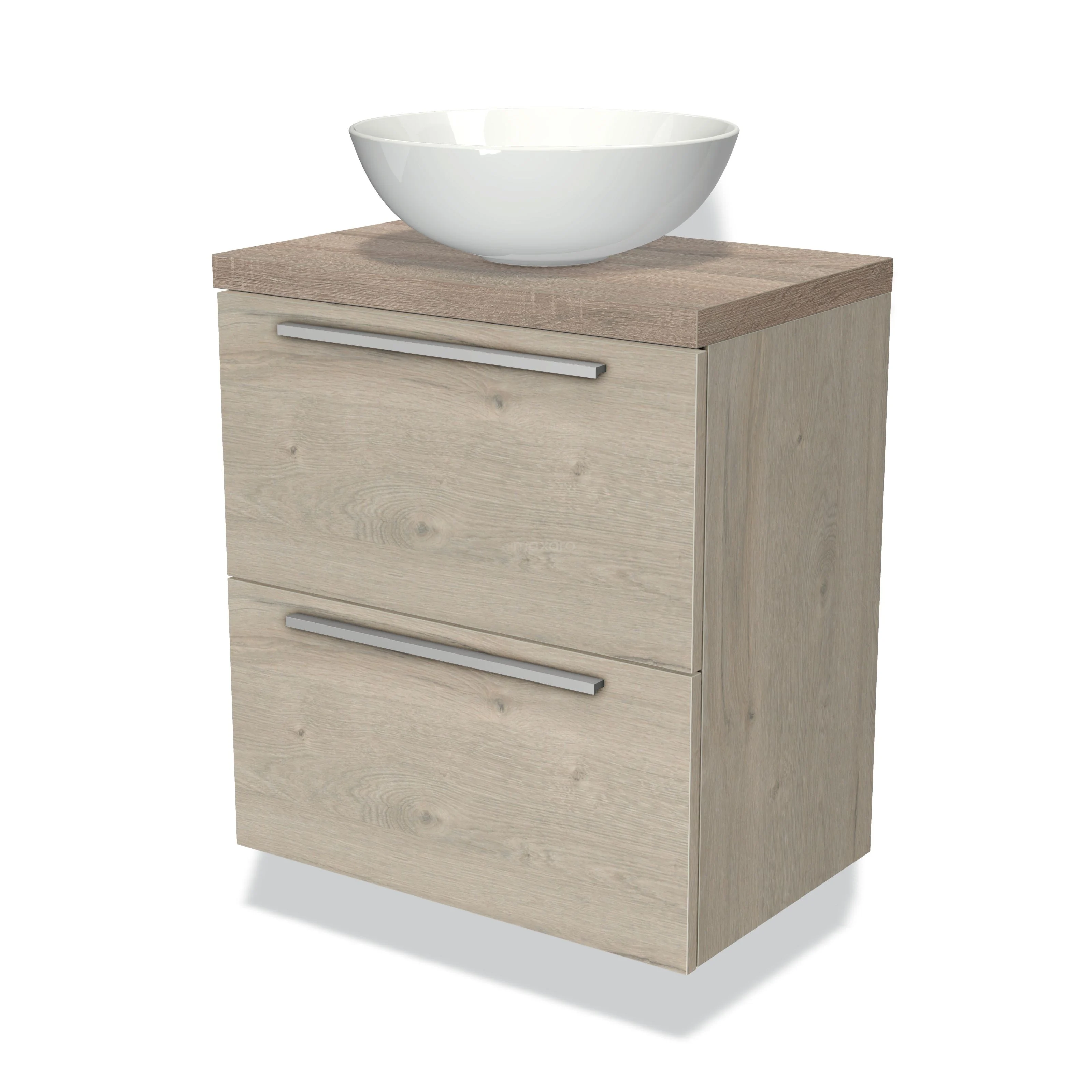 Modulo Plato Slim Badmöbel mit Aufsatzwaschbecken | 60 cm Hellgraue Eiche Flach front Eiche blatt 2 übereinanderliegende Schubladen