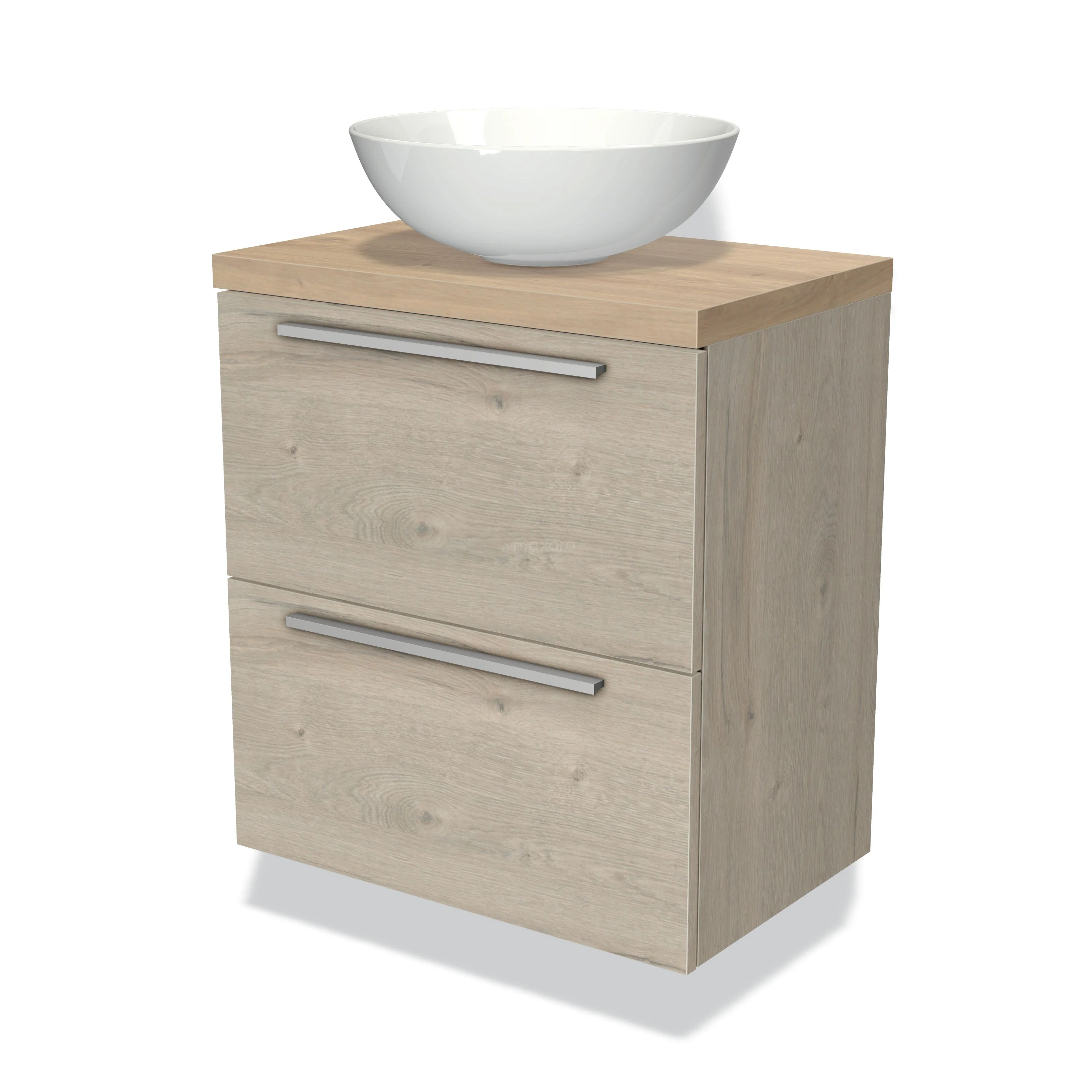 Modulo Plato Slim Badmöbel mit Aufsatzwaschbecken | 60 cm Hellgraue Eiche Flach front Hellbraune Eiche blatt 2 übereinanderliegende Schubladen
