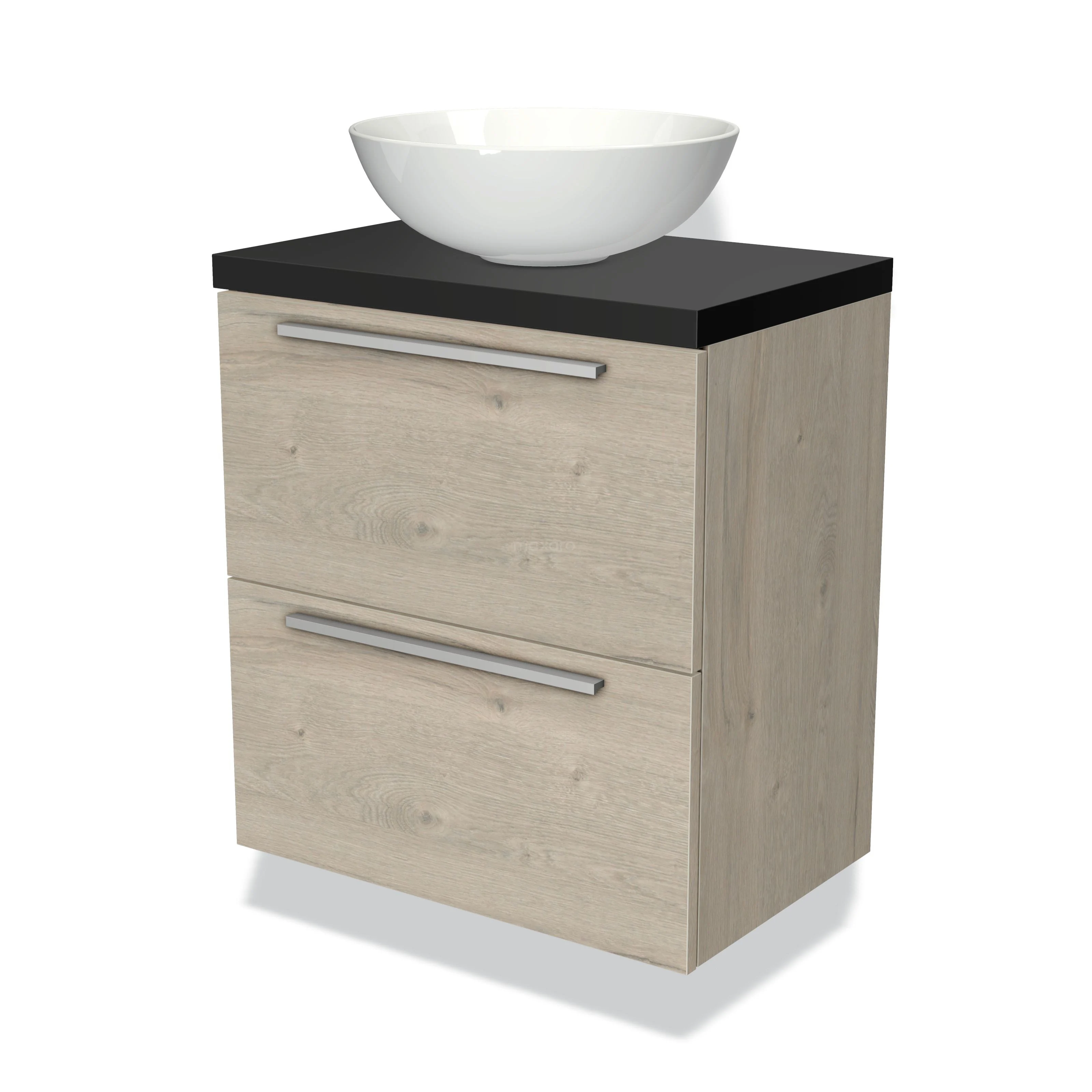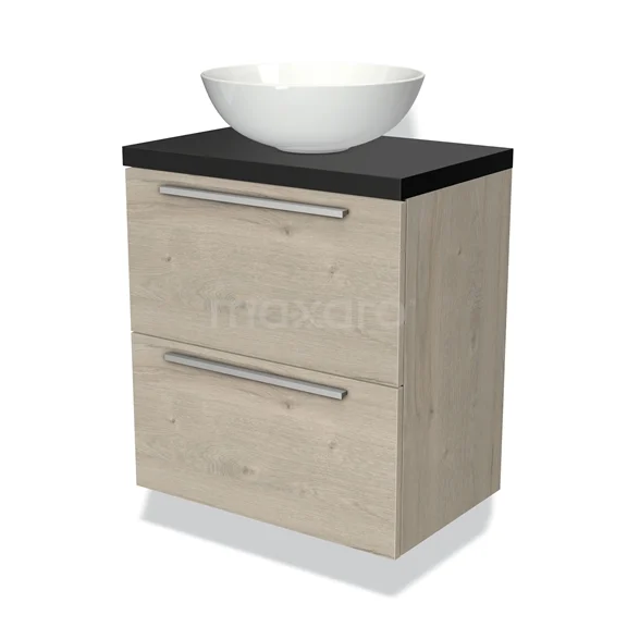 Modulo Plato Slim Badmöbel mit Aufsatzwaschbecken | 60 cm Hellgraue Eiche Flach front Matt Schwarz blatt 2 übereinanderliegende Schubladen
