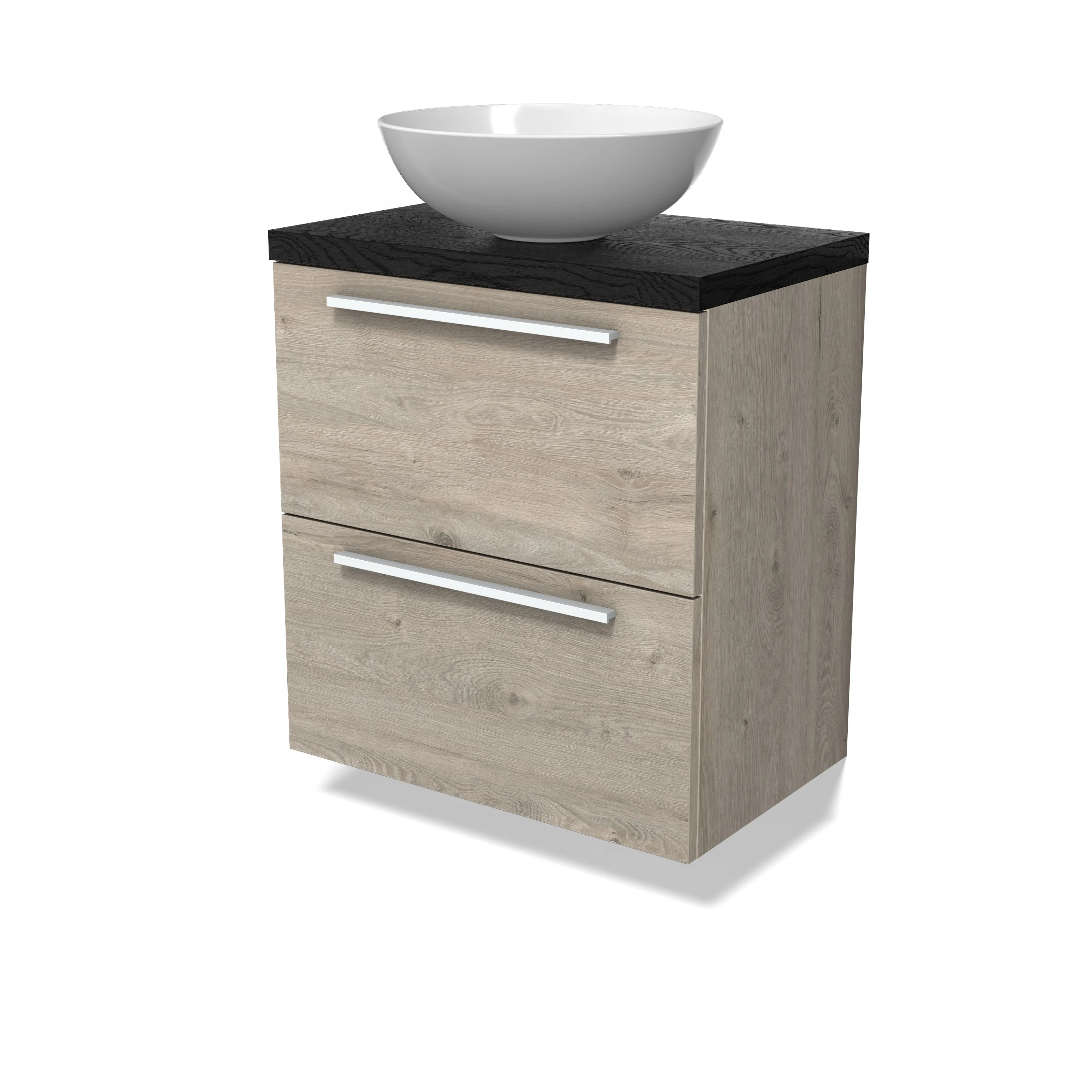 Modulo Plato Slim Badmöbel mit Aufsatzwaschbecken | 60 cm Hellgraue Eiche Flach front Schwarze Eiche blatt 2 übereinanderliegende Schubladen
