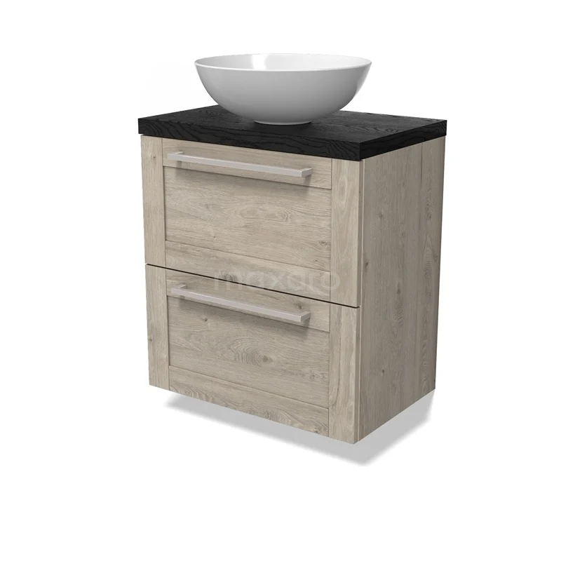 Modulo Plato Slim Badmöbel mit Aufsatzwaschbecken | 60 cm Hellgraue Eiche Rahmen front Schwarze Eiche blatt 2 übereinanderliegende Schubladen