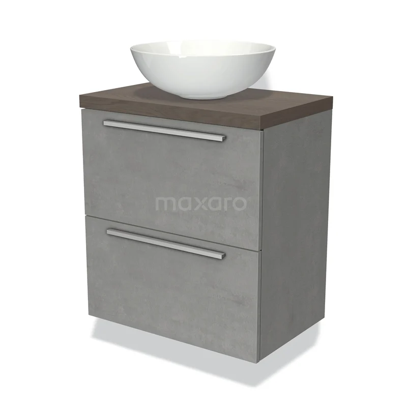 Modulo Plato Slim Badmöbel mit Aufsatzwaschbecken | 60 cm Hellgrauer Beton Flach front Dunkelbraune Eiche blatt 2 übereinanderliegende Schubladen
