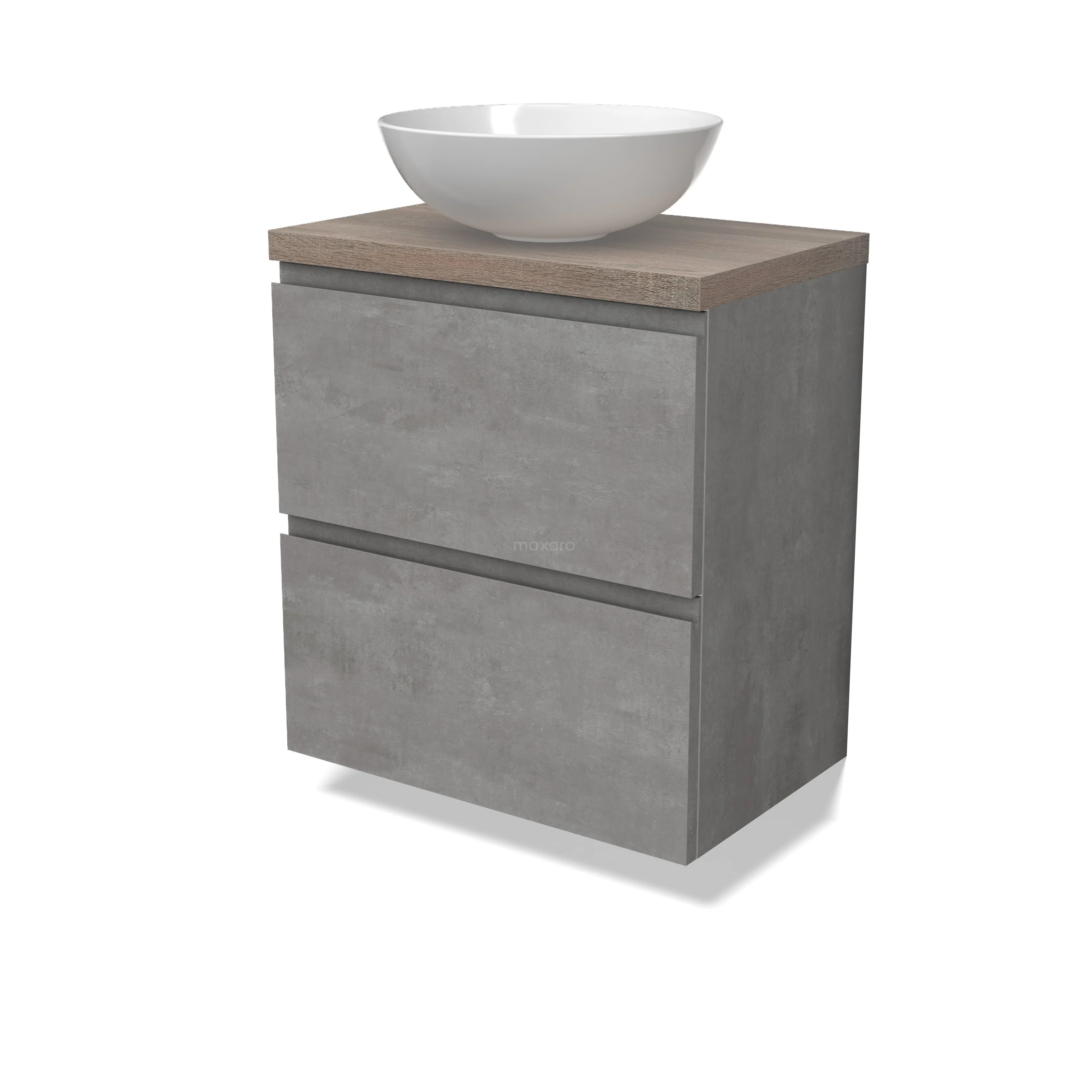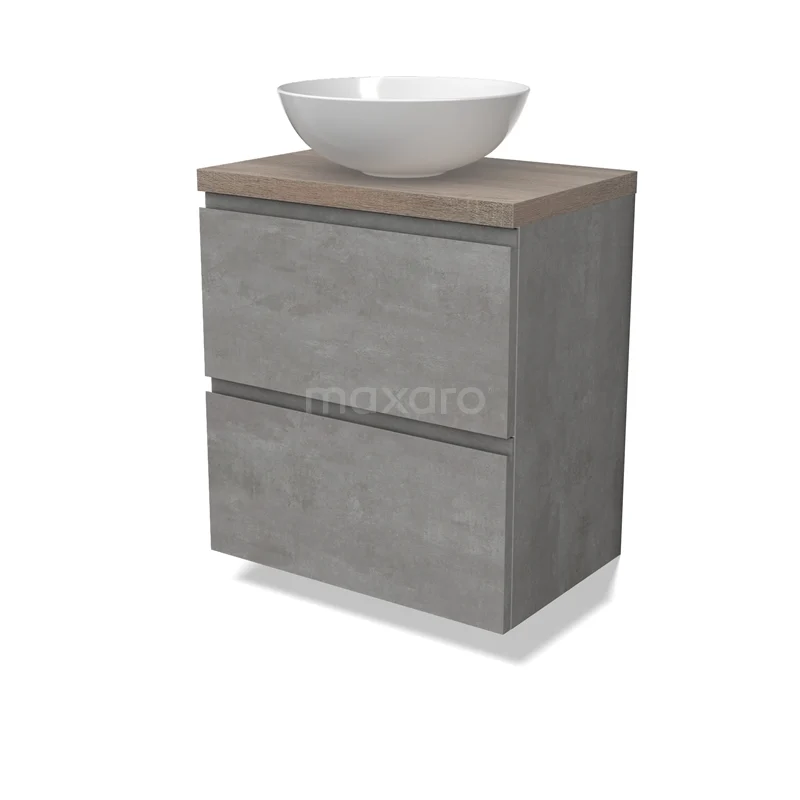 Modulo Plato Slim Badmöbel mit Aufsatzwaschbecken | 60 cm Hellgrauer Beton Grifflos front Eiche blatt 2 übereinanderliegende Schubladen