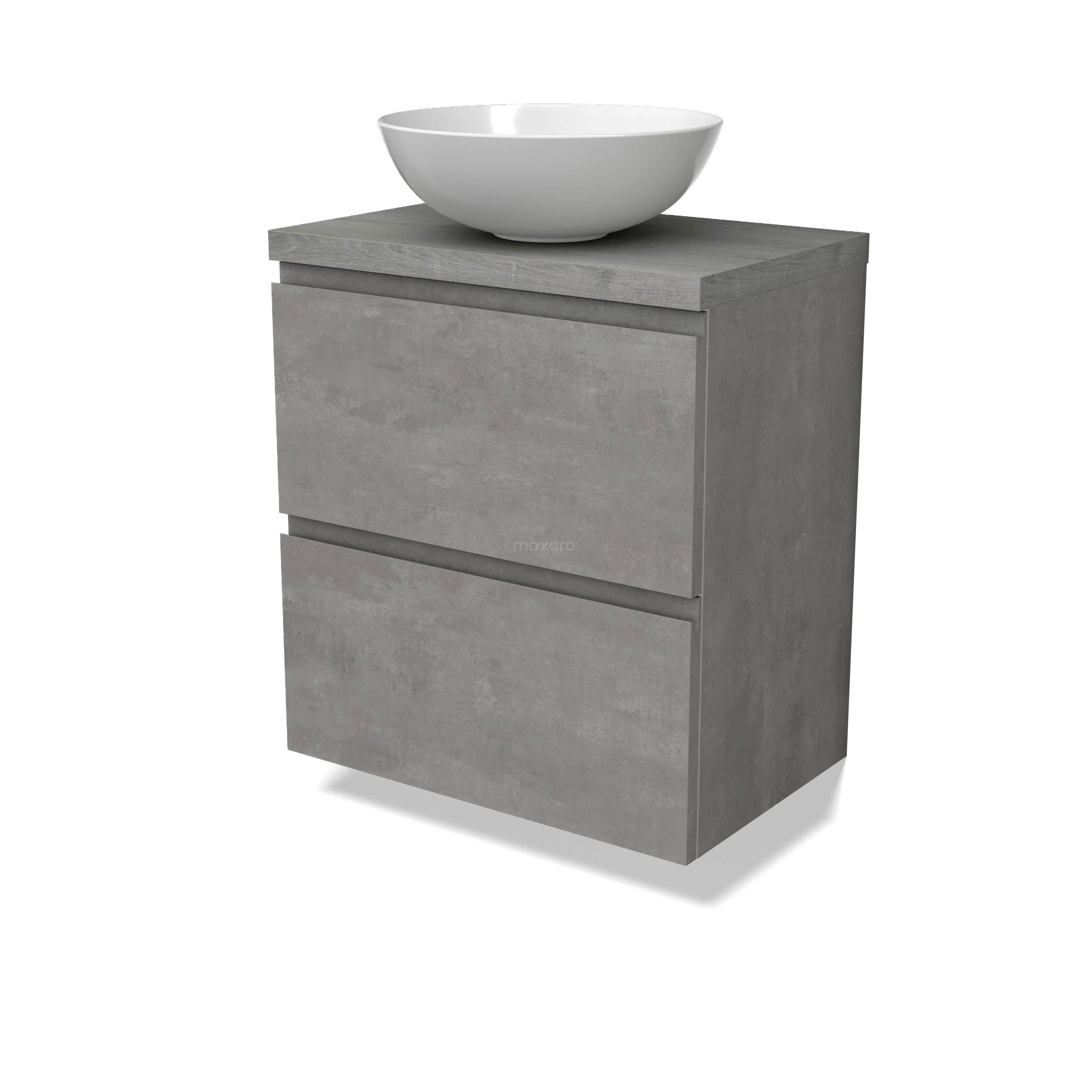 Modulo Plato Slim Badmöbel mit Aufsatzwaschbecken | 60 cm Hellgrauer Beton Grifflos front Graue Eiche blatt 2 übereinanderliegende Schubladen