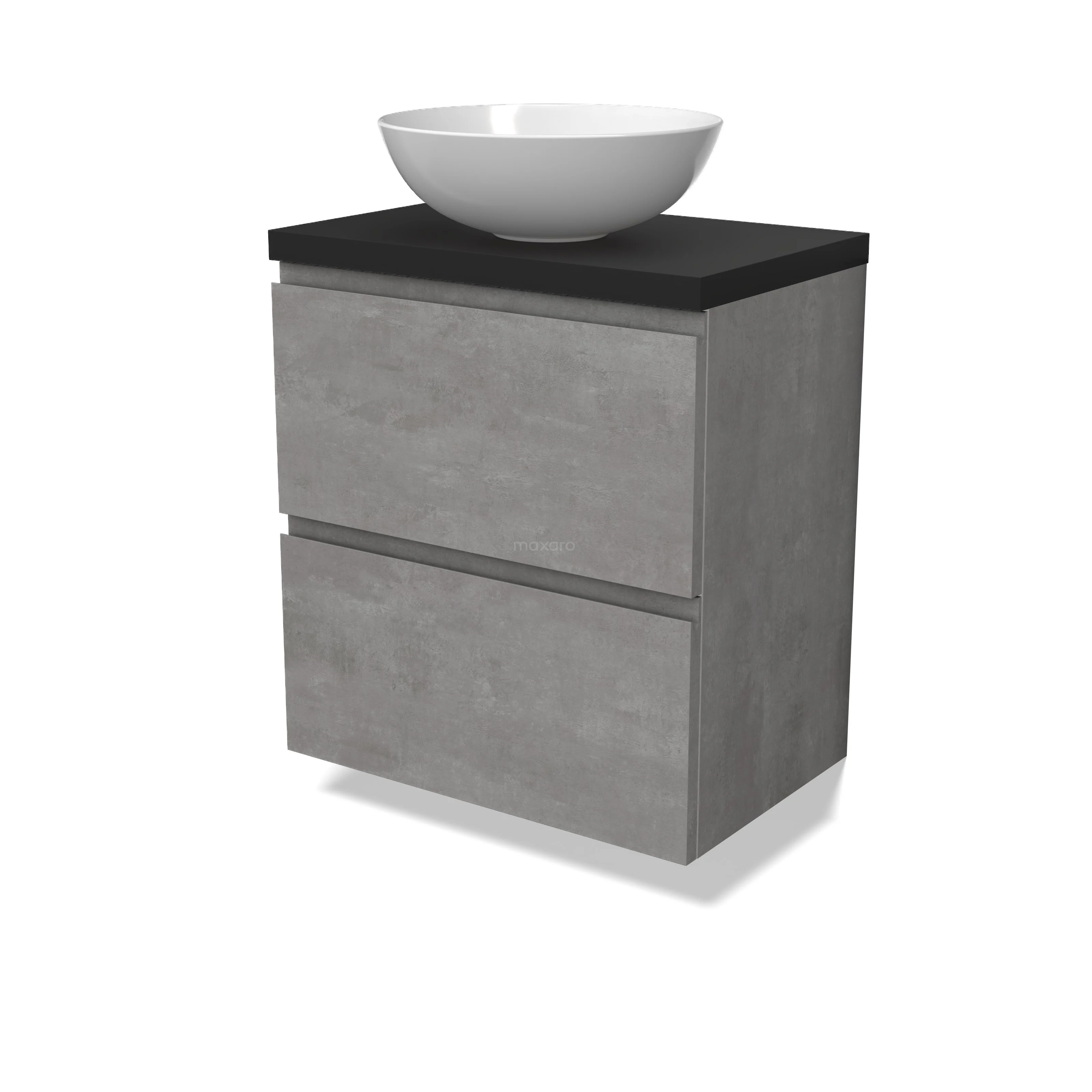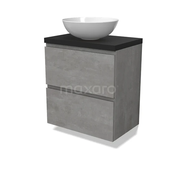 Modulo Plato Slim Badmöbel mit Aufsatzwaschbecken | 60 cm Hellgrauer Beton Grifflos front Matt Schwarz blatt 2 übereinanderliegende Schubladen