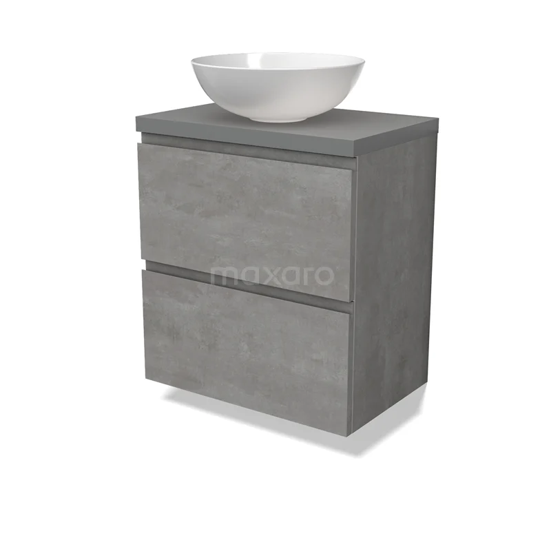 Modulo Plato Slim Badmöbel mit Aufsatzwaschbecken | 60 cm Hellgrauer Beton Grifflos front Mittelgrau blatt 2 übereinanderliegende Schubladen