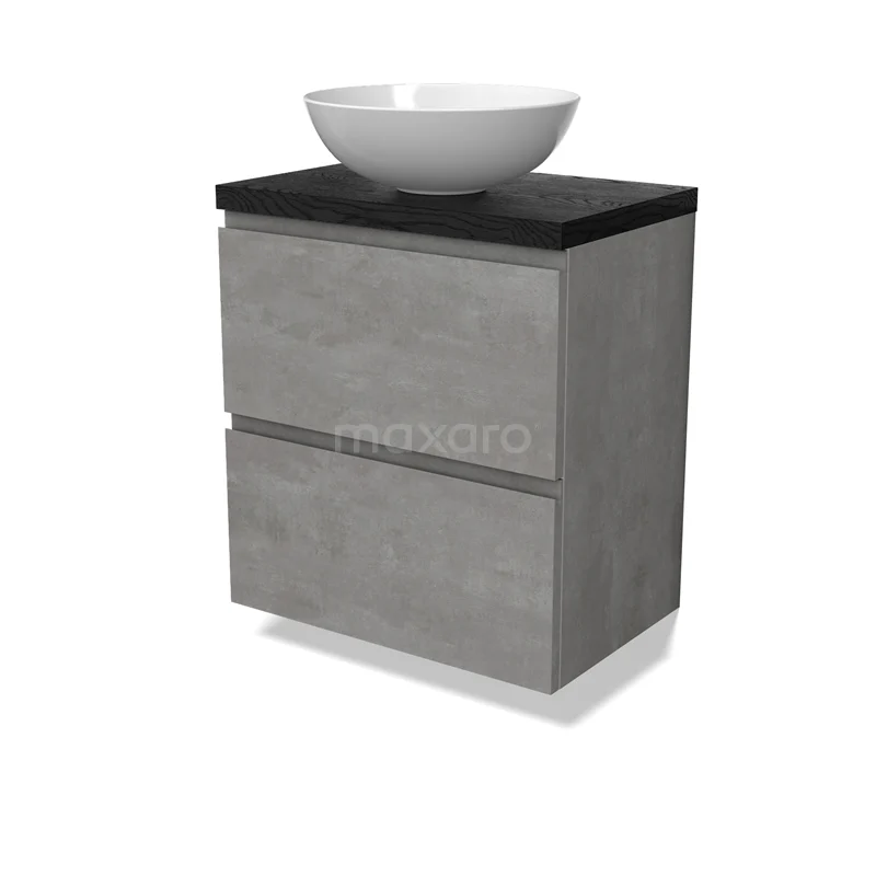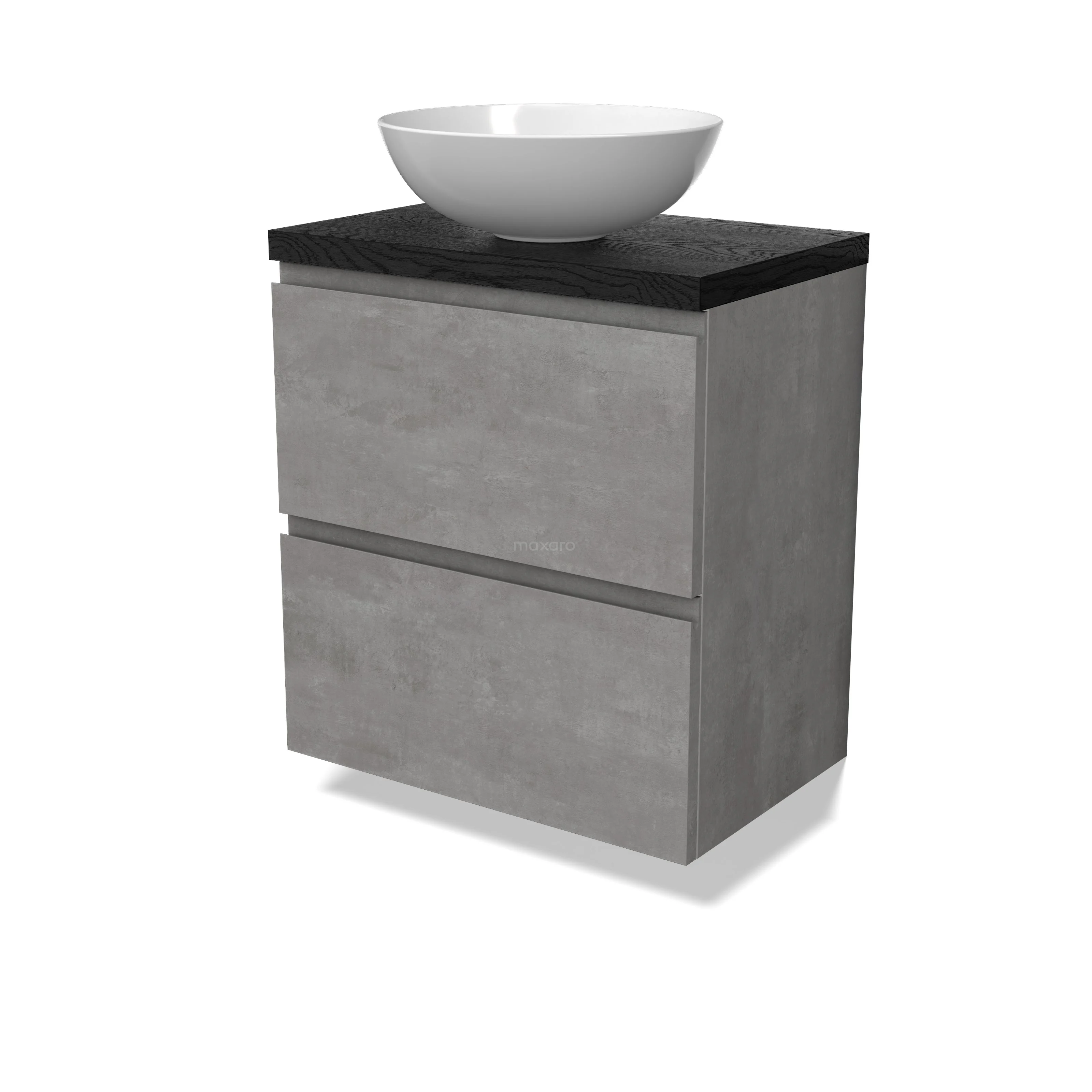Modulo Plato Slim Badmöbel mit Aufsatzwaschbecken | 60 cm Hellgrauer Beton Grifflos front Schwarze Eiche blatt 2 übereinanderliegende Schubladen