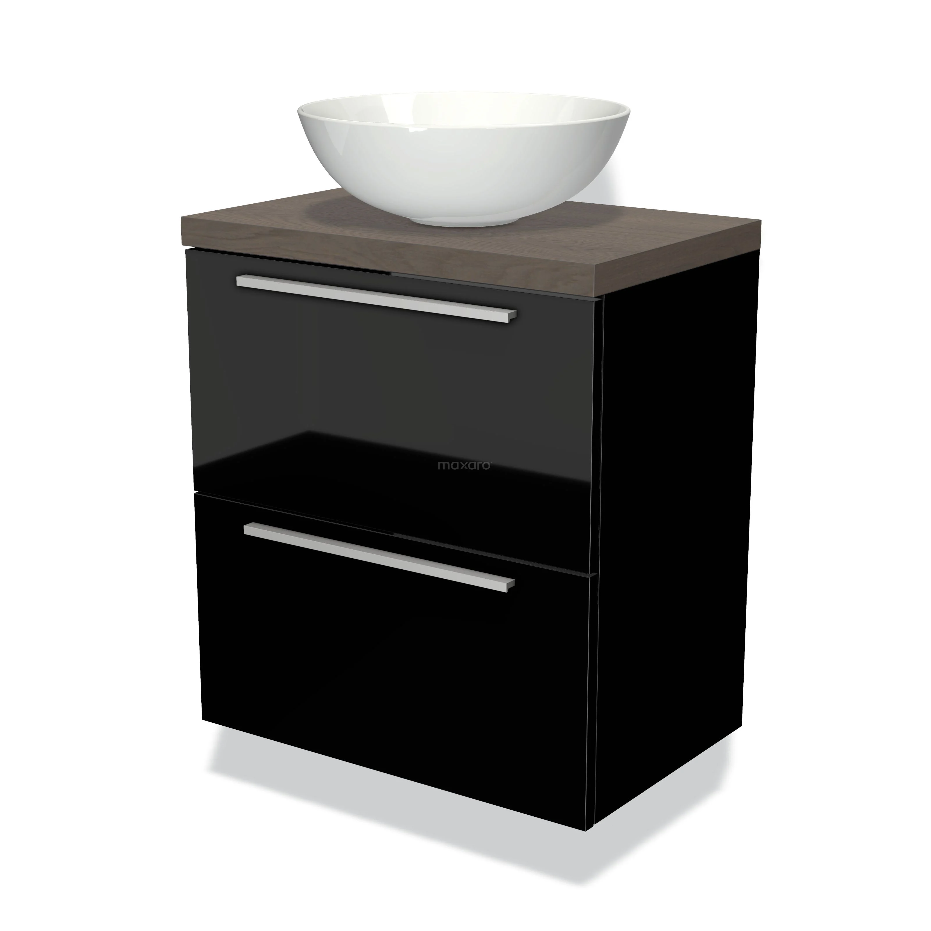 Modulo Plato Slim Badmöbel mit Aufsatzwaschbecken | 60 cm Hochglanz Schwarz Flach front Dunkelbraune Eiche blatt 2 übereinanderliegende Schubladen