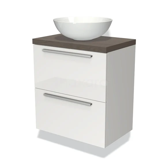 Modulo Plato Slim Badmöbel mit Aufsatzwaschbecken | 60 cm Hochglanz Weiß Flach front Dunkelbraune Eiche blatt 2 übereinanderliegende Schubladen