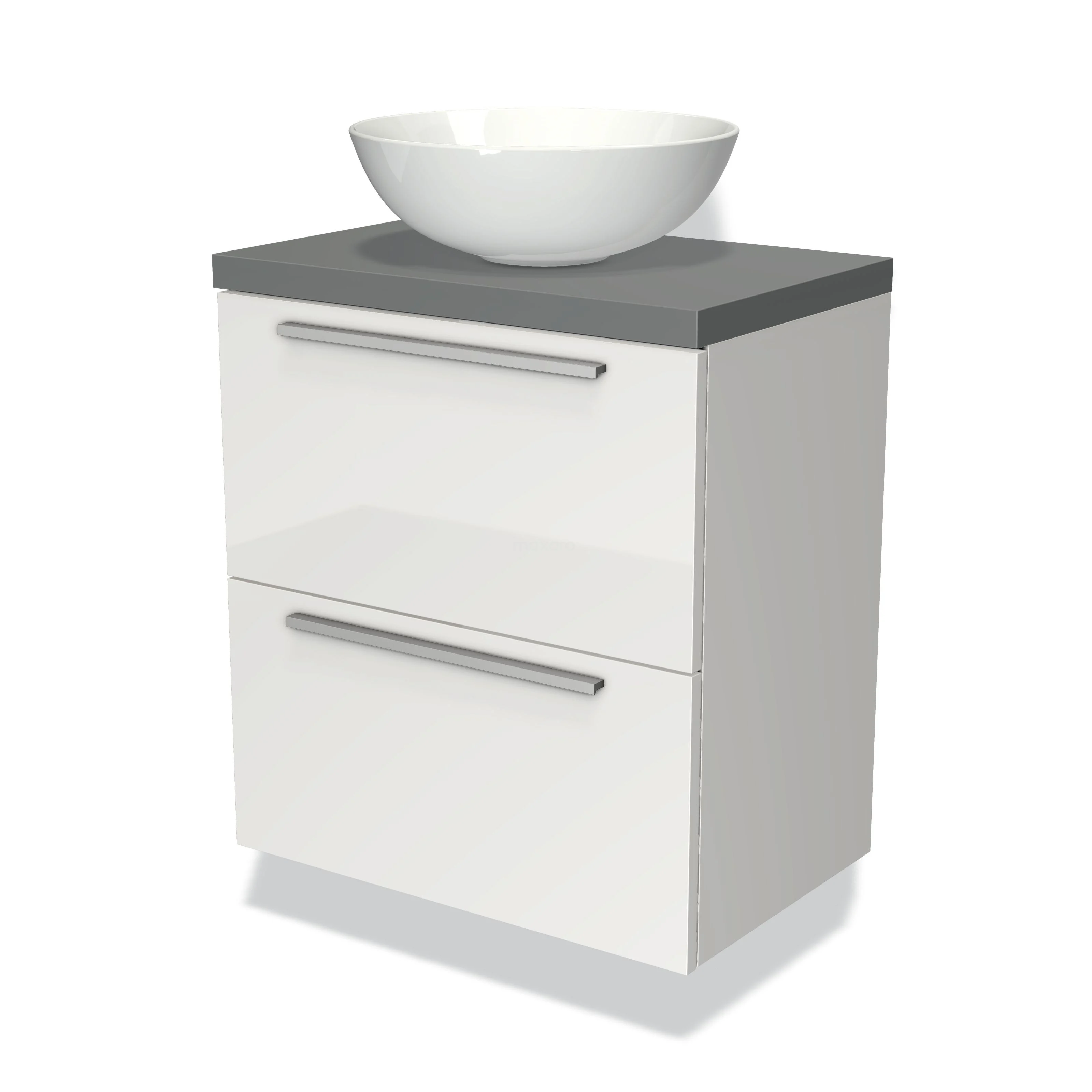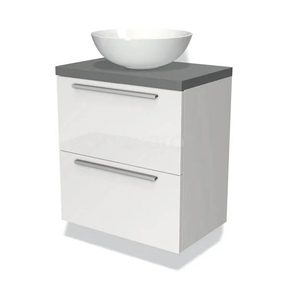 Modulo Plato Slim Badmöbel mit Aufsatzwaschbecken | 60 cm Hochglanz Weiß Flach front Mittelgrau blatt 2 übereinanderliegende Schubladen