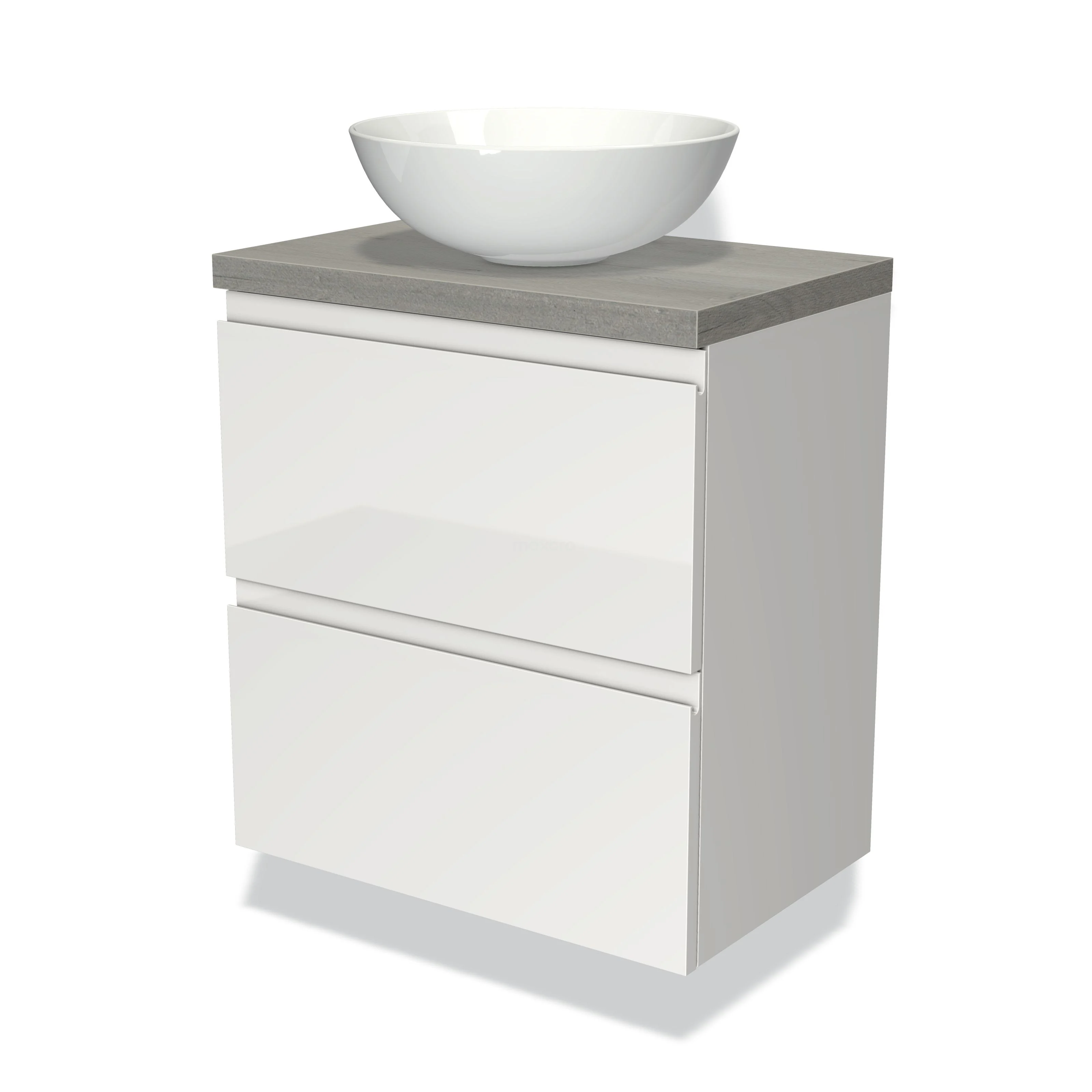 Modulo Plato Slim Badmöbel mit Aufsatzwaschbecken | 60 cm Hochglanz Weiß Grifflos front Graue Eiche blatt 2 übereinanderliegende Schubladen