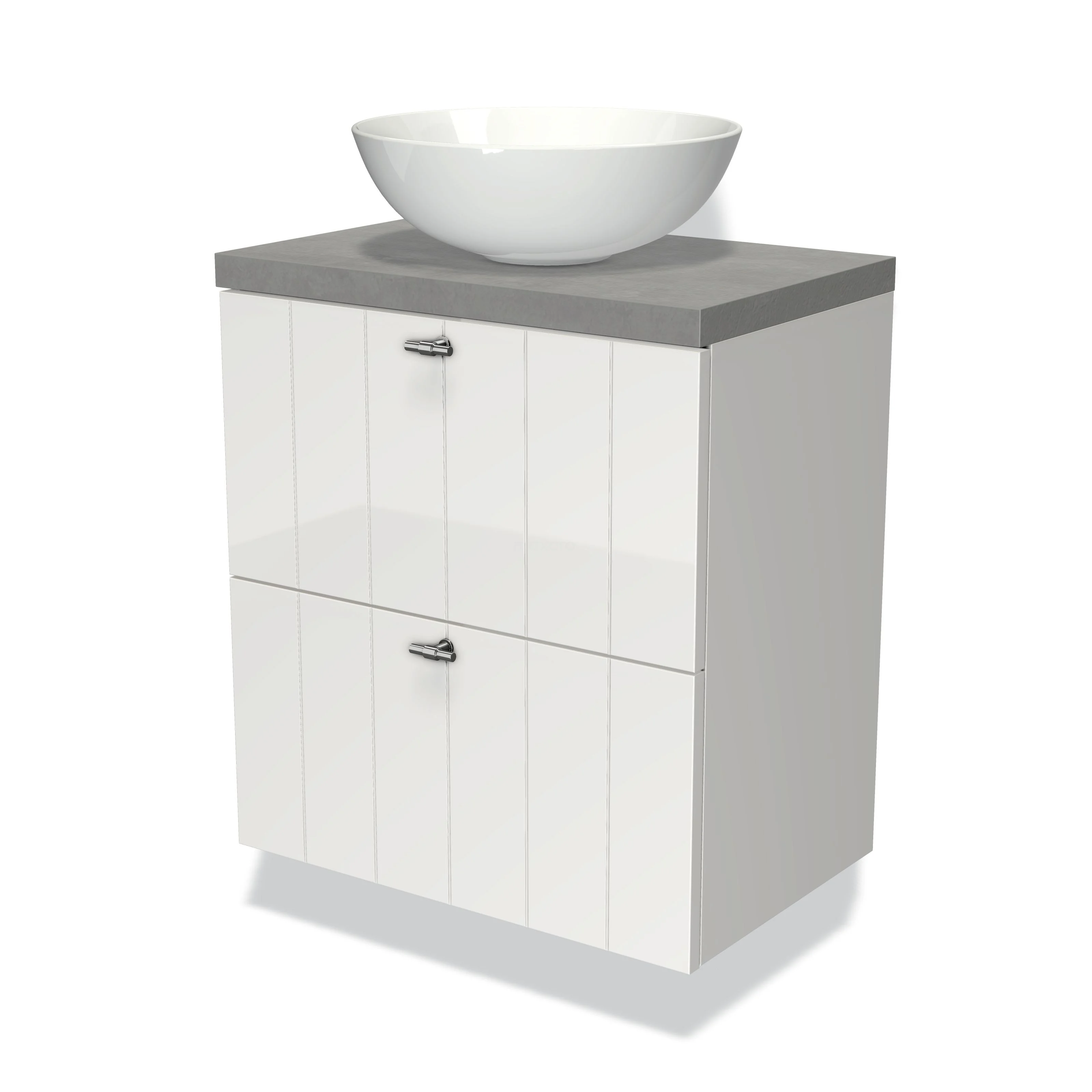 Modulo Plato Slim Badmöbel mit Aufsatzwaschbecken | 60 cm Hochglanz Weiß Lamelle front Hellgrauer Beton blatt 2 übereinanderliegende Schubladen