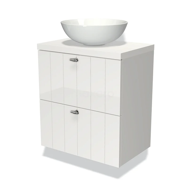 Modulo Plato Slim Badmöbel mit Aufsatzwaschbecken | 60 cm Hochglanz Weiß Lamelle front Matt Weiß blatt 2 übereinanderliegende Schubladen
