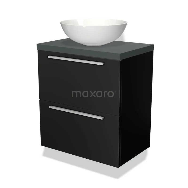 Modulo Plato Slim Badmöbel mit Aufsatzwaschbecken | 60 cm Matt Schwarz Flach front Dunkelgrau blatt 2 übereinanderliegende Schubladen