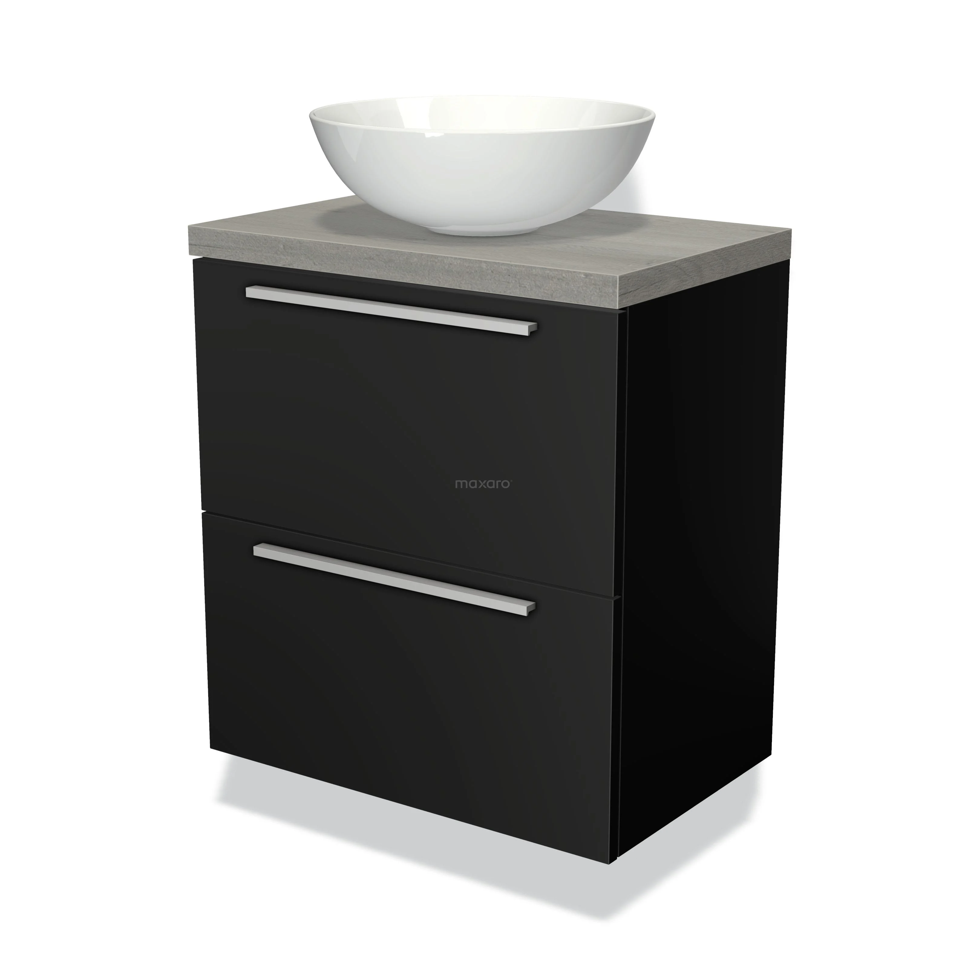 Modulo Plato Slim Badmöbel mit Aufsatzwaschbecken | 60 cm Matt Schwarz Flach front Graue Eiche blatt 2 übereinanderliegende Schubladen