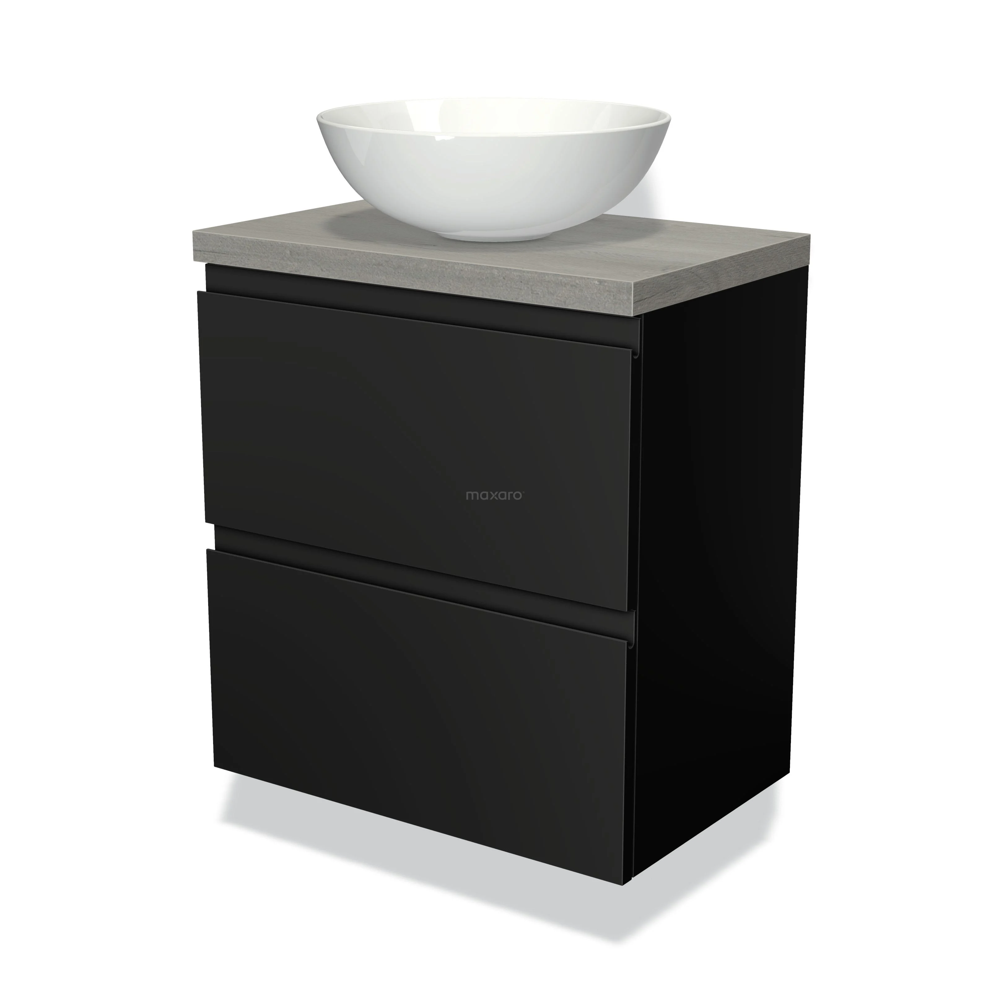 Modulo Plato Slim Badmöbel mit Aufsatzwaschbecken | 60 cm Matt Schwarz Grifflos front Graue Eiche blatt 2 übereinanderliegende Schubladen