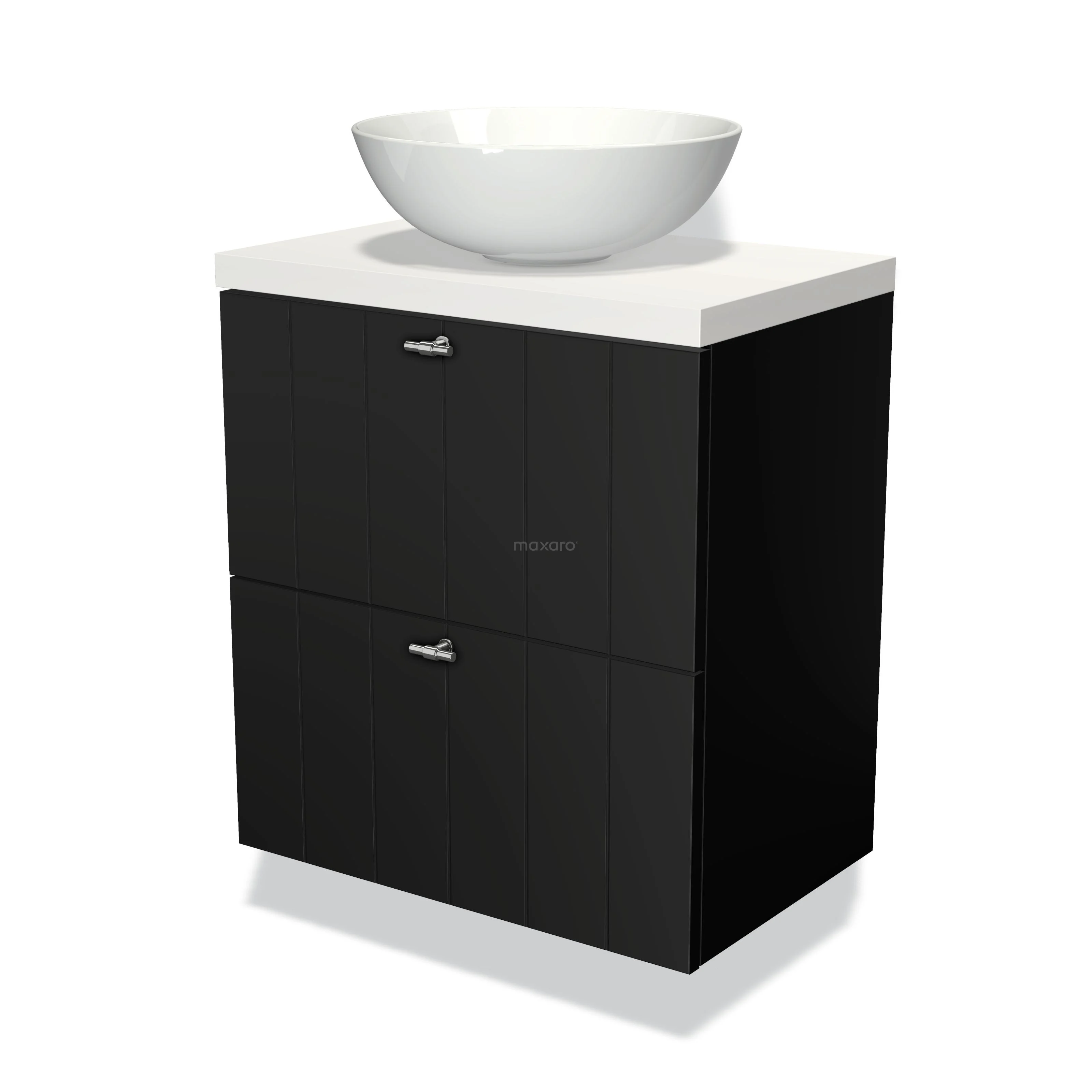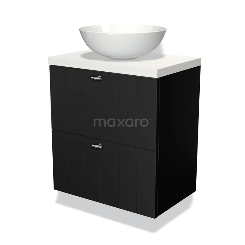 Modulo Plato Slim Badmöbel mit Aufsatzwaschbecken | 60 cm Matt Schwarz Lamelle front Matt Weiß blatt 2 übereinanderliegende Schubladen