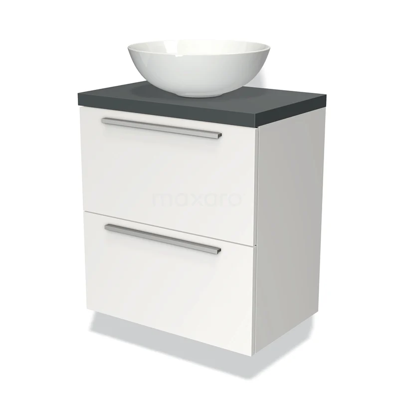 Modulo Plato Slim Badmöbel mit Aufsatzwaschbecken | 60 cm Matt Weiß Flach front Dunkelgrau blatt 2 übereinanderliegende Schubladen