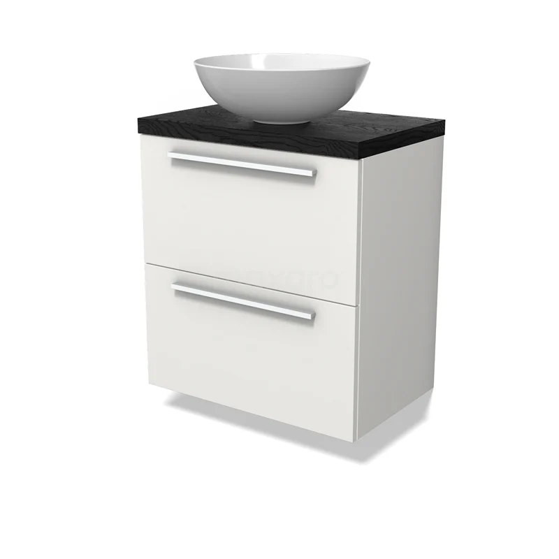 Modulo Plato Slim Badmöbel mit Aufsatzwaschbecken | 60 cm Matt Weiß Flach front Schwarze Eiche blatt 2 übereinanderliegende Schubladen