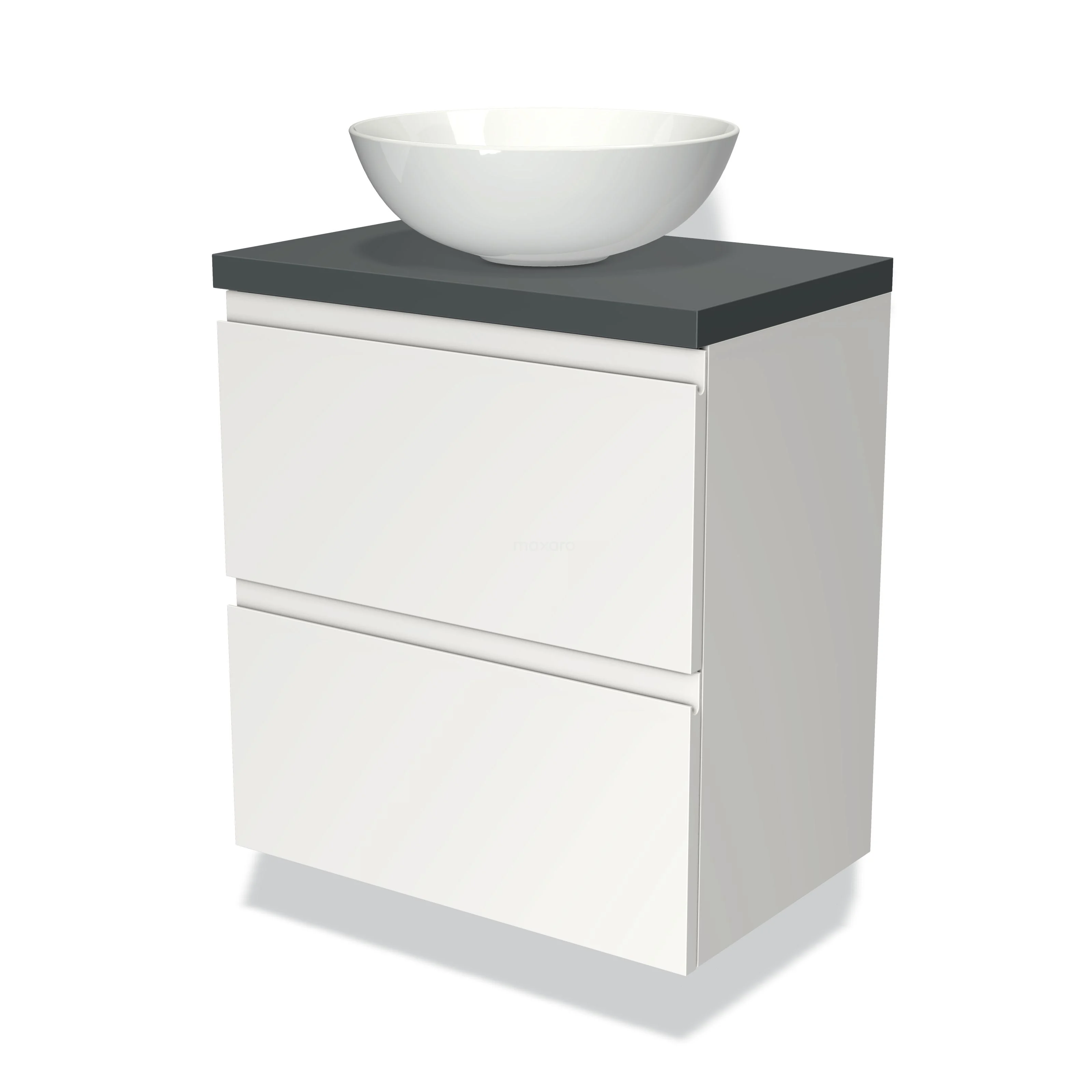 Modulo Plato Slim Badmöbel mit Aufsatzwaschbecken | 60 cm Matt Weiß Grifflos front Dunkelgrau blatt 2 übereinanderliegende Schubladen