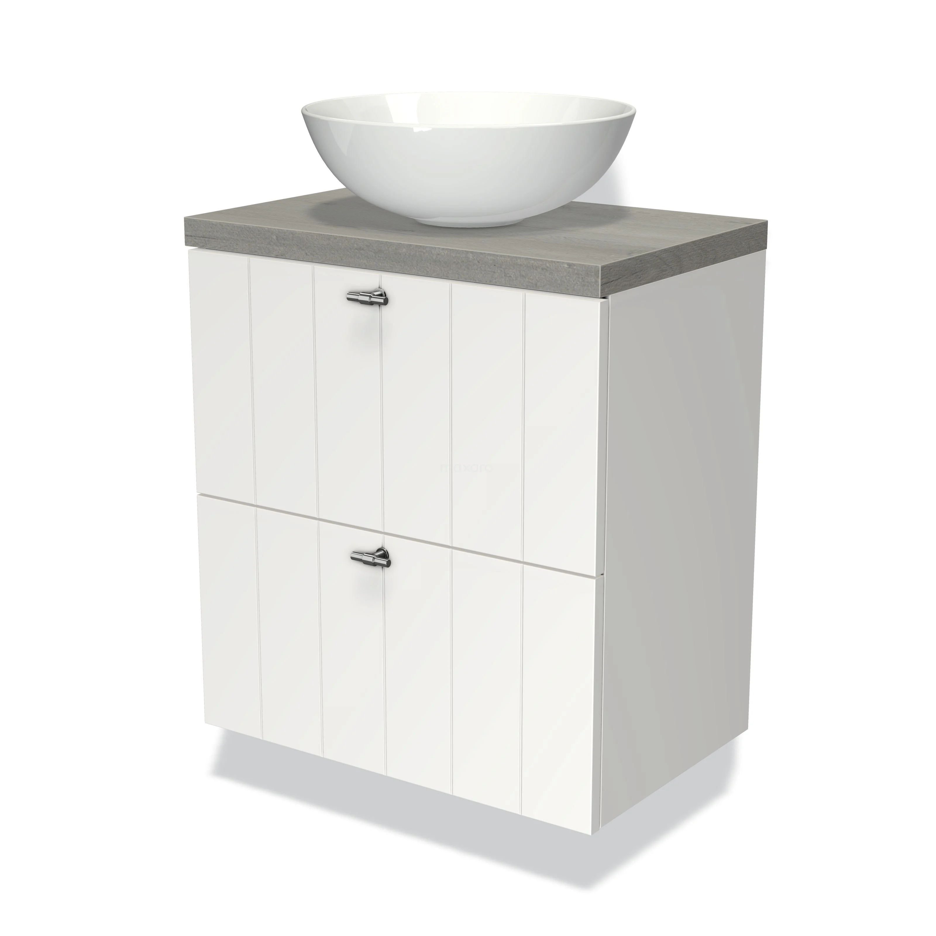 Modulo Plato Slim Badmöbel mit Aufsatzwaschbecken | 60 cm Matt Weiß Lamelle front Graue Eiche blatt 2 übereinanderliegende Schubladen