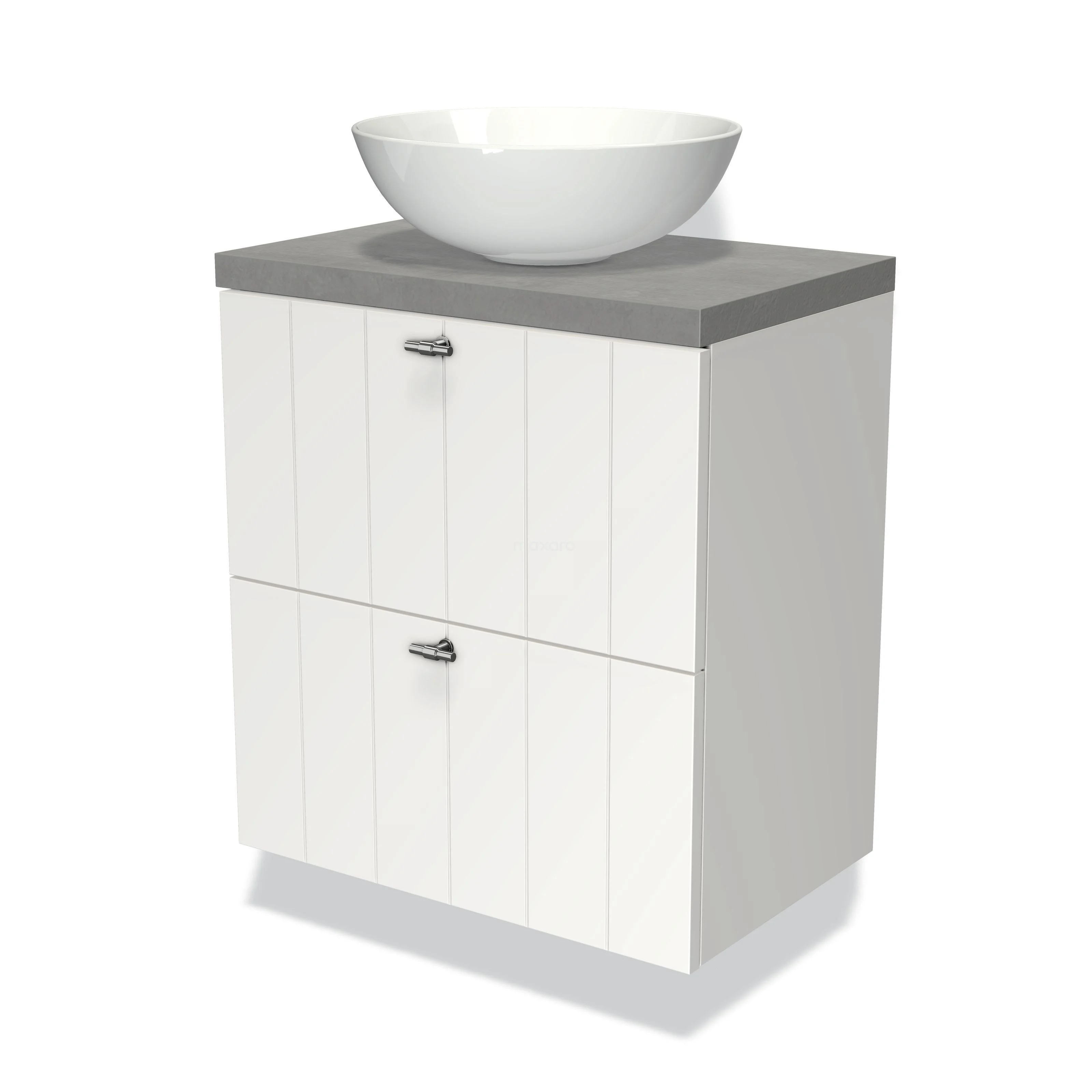 Modulo Plato Slim Badmöbel mit Aufsatzwaschbecken | 60 cm Matt Weiß Lamelle front Hellgrauer Beton blatt 2 übereinanderliegende Schubladen