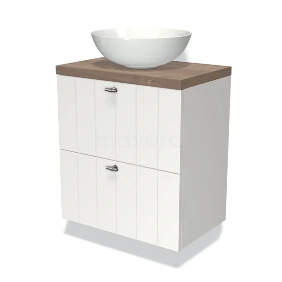 Modulo Plato Slim Badmöbel mit Aufsatzwaschbecken | 60 cm Matt Weiß Lamelle front Mittelbraune Eiche blatt 2 übereinanderliegende Schubladen