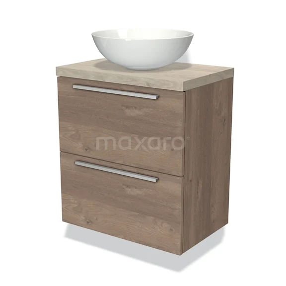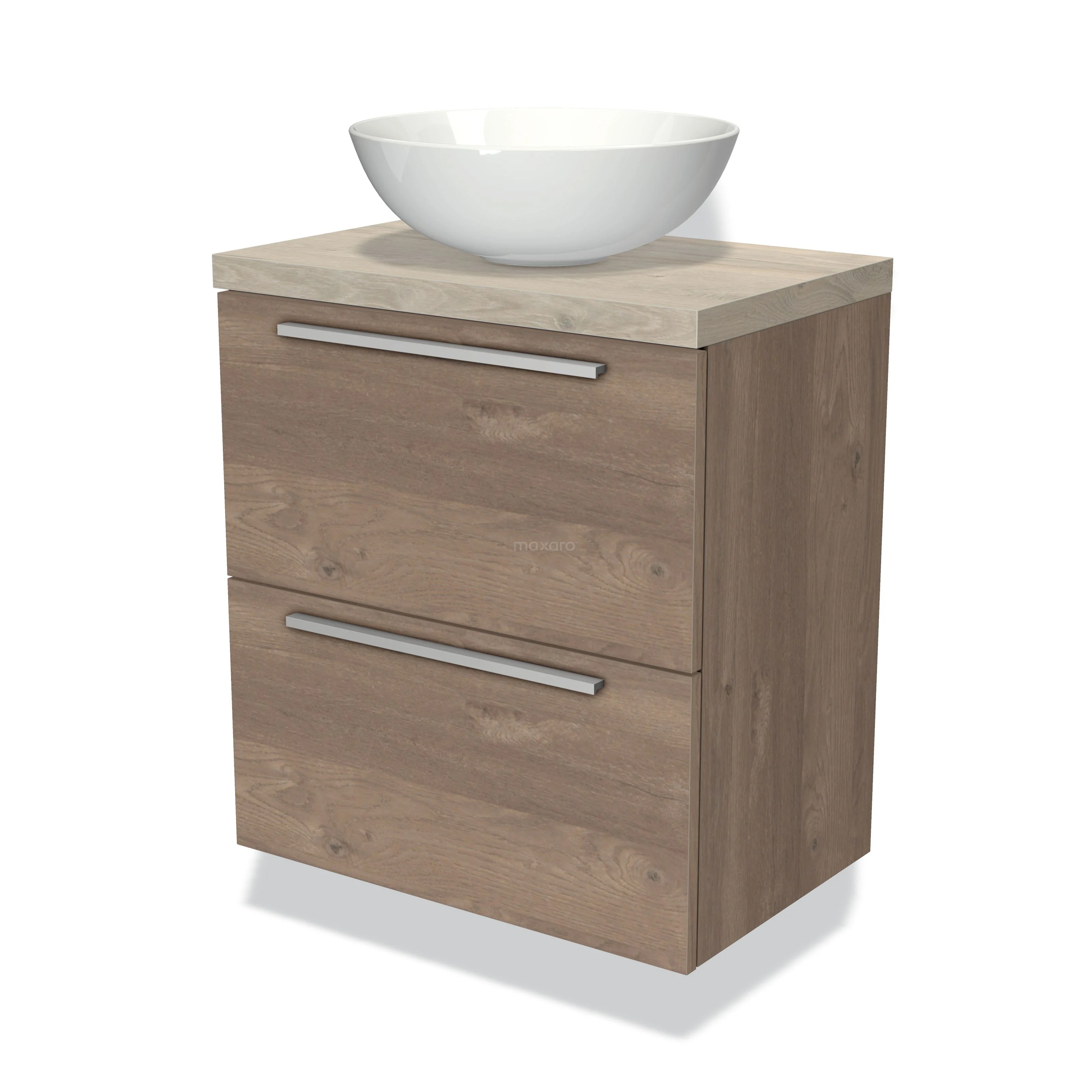 Modulo Plato Slim Badmöbel mit Aufsatzwaschbecken | 60 cm Mittelbraune Eiche Flach front Hellgraue Eiche blatt 2 übereinanderliegende Schubladen