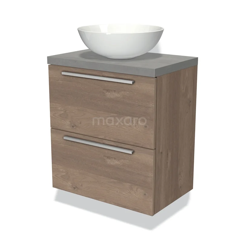 Modulo Plato Slim Badmöbel mit Aufsatzwaschbecken | 60 cm Mittelbraune Eiche Flach front Hellgrauer Beton blatt 2 übereinanderliegende Schubladen