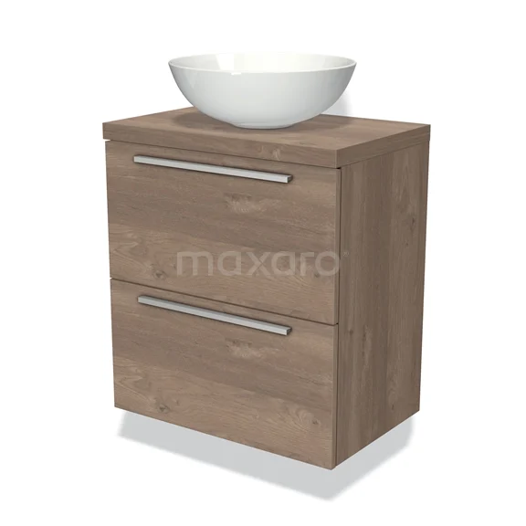 Modulo Plato Slim Badmöbel mit Aufsatzwaschbecken | 60 cm Mittelbraune Eiche Flach front Mittelbraune Eiche blatt 2 übereinanderliegende Schubladen