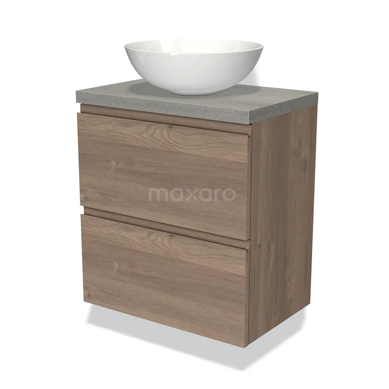 Modulo Plato Slim Badmöbel mit Aufsatzwaschbecken | 60 cm Mittelbraune Eiche Grifflos front Graue Eiche blatt 2 übereinanderliegende Schubladen