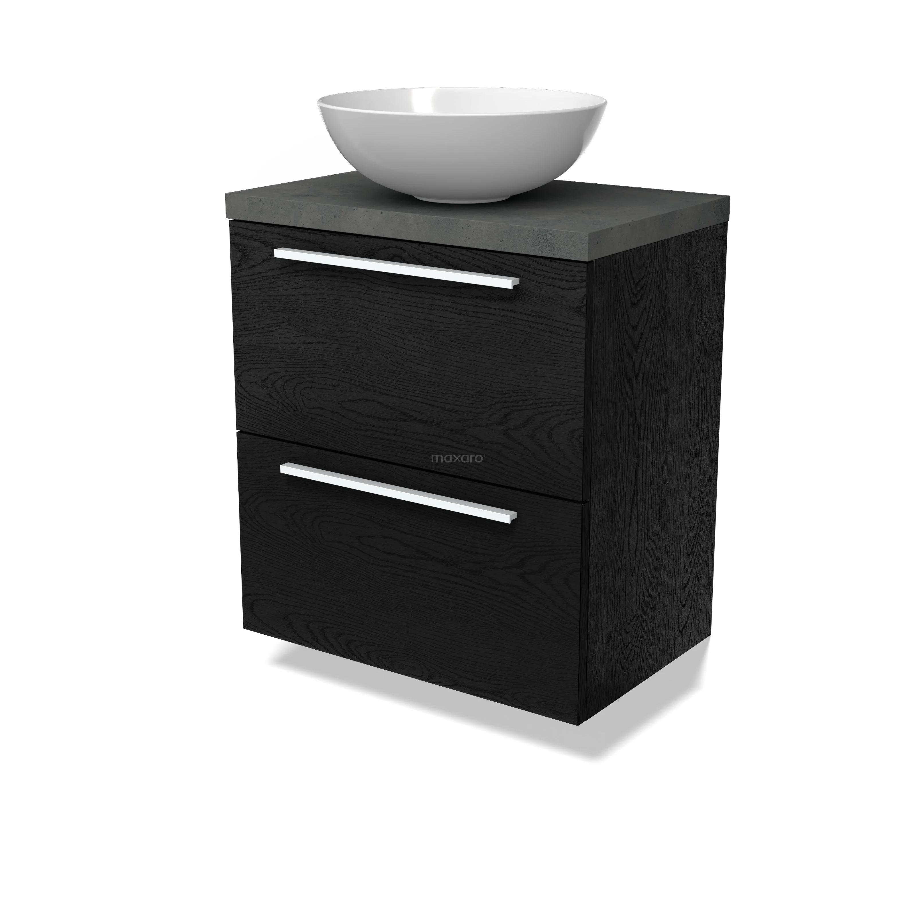 Modulo Plato Slim Badmöbel mit Aufsatzwaschbecken | 60 cm Schwarze Eiche Flach front Dunkelgrauer Beton blatt 2 übereinanderliegende Schubladen