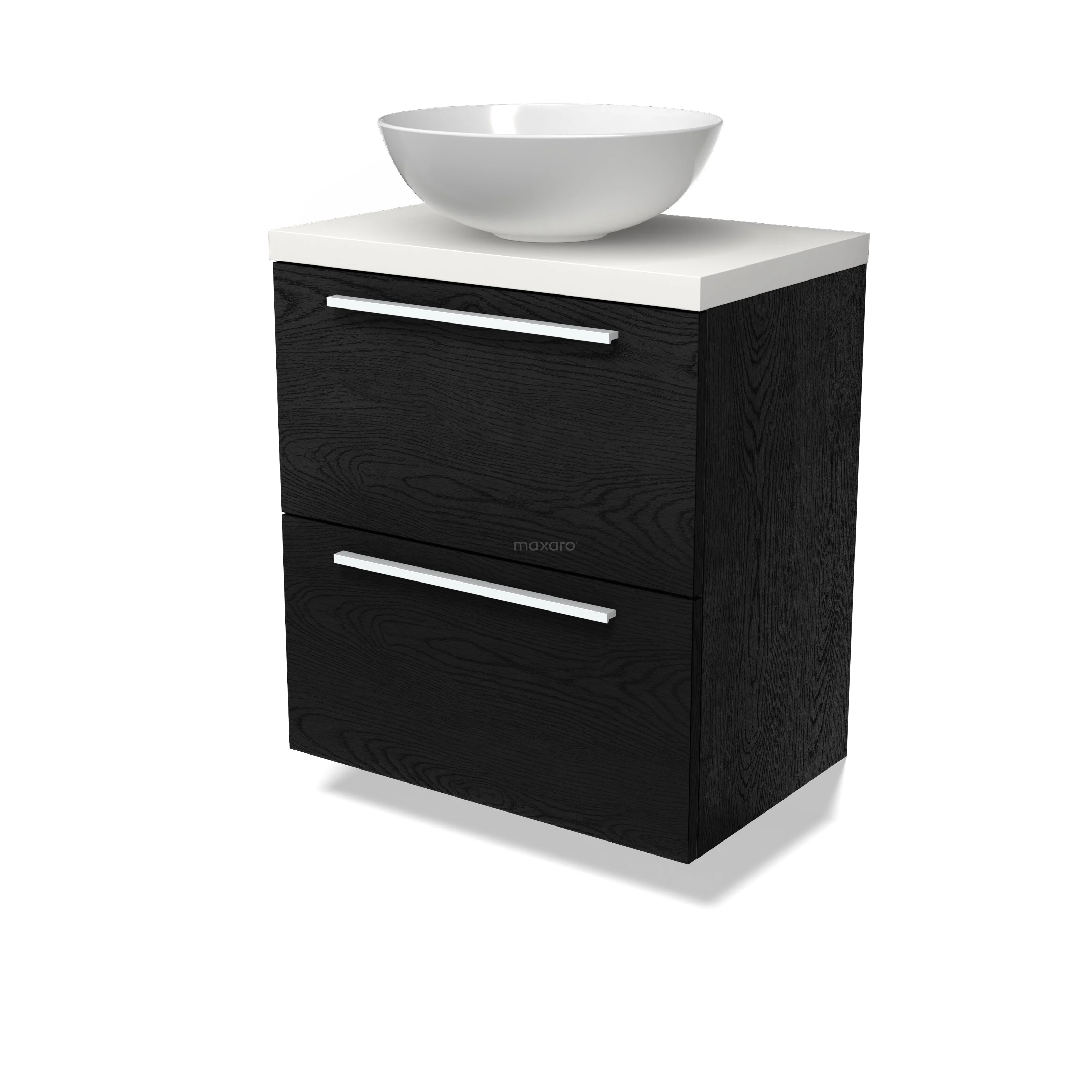 Modulo Plato Slim Badmöbel mit Aufsatzwaschbecken | 60 cm Schwarze Eiche Flach front Matt Weiß blatt 2 übereinanderliegende Schubladen