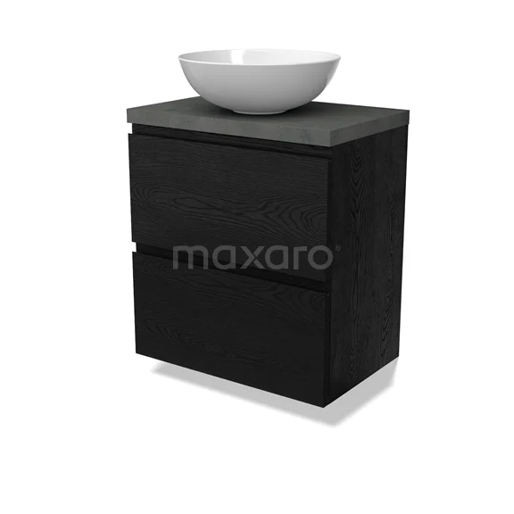 Modulo Plato Slim Badmöbel mit Aufsatzwaschbecken | 60 cm Schwarze Eiche Grifflos front Dunkelgrauer Beton blatt 2 übereinanderliegende Schubladen